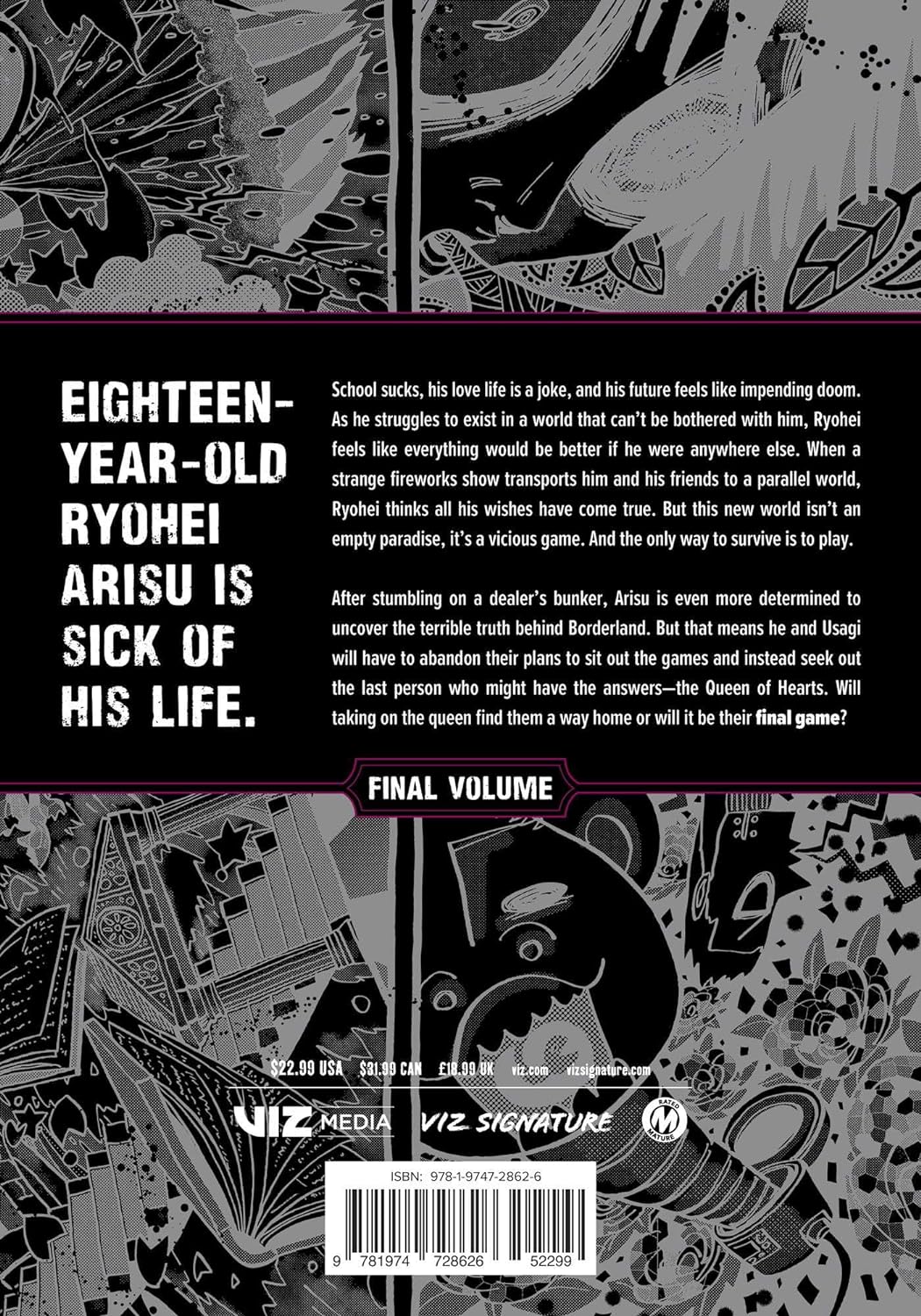After stumbling on a dealer’s bunker, Arisu is even more determined to uncover the terrible truth behind Borderland. But that means he and Usagi will have to abandon their plans to sit out the games and instead seek out the last person who might have the answers—the Queen of Hearts. Will taking on the queen find them a way home, or will it be their final game?