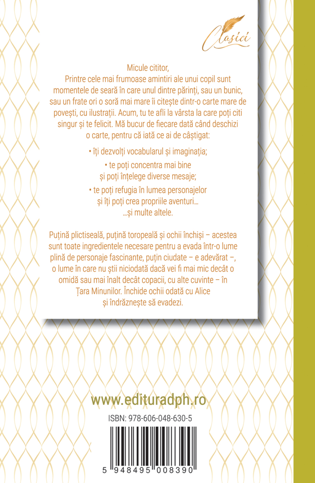 Puțină plictiseală, puțină toropeală și ochii închiși – acestea sunt toate ingredientele necesare pentru a evada într-o lume plină de personaje fascinante, puțin ciudate – e adevărat –, o lume în care nu știi niciodată dacă vei fi mai mic decât o omidă sau mai înalt decât copacii, cu alte cuvinte – în Țara Minunilor. Închide ochii odată cu Alice și îndrăznește să evadezi.