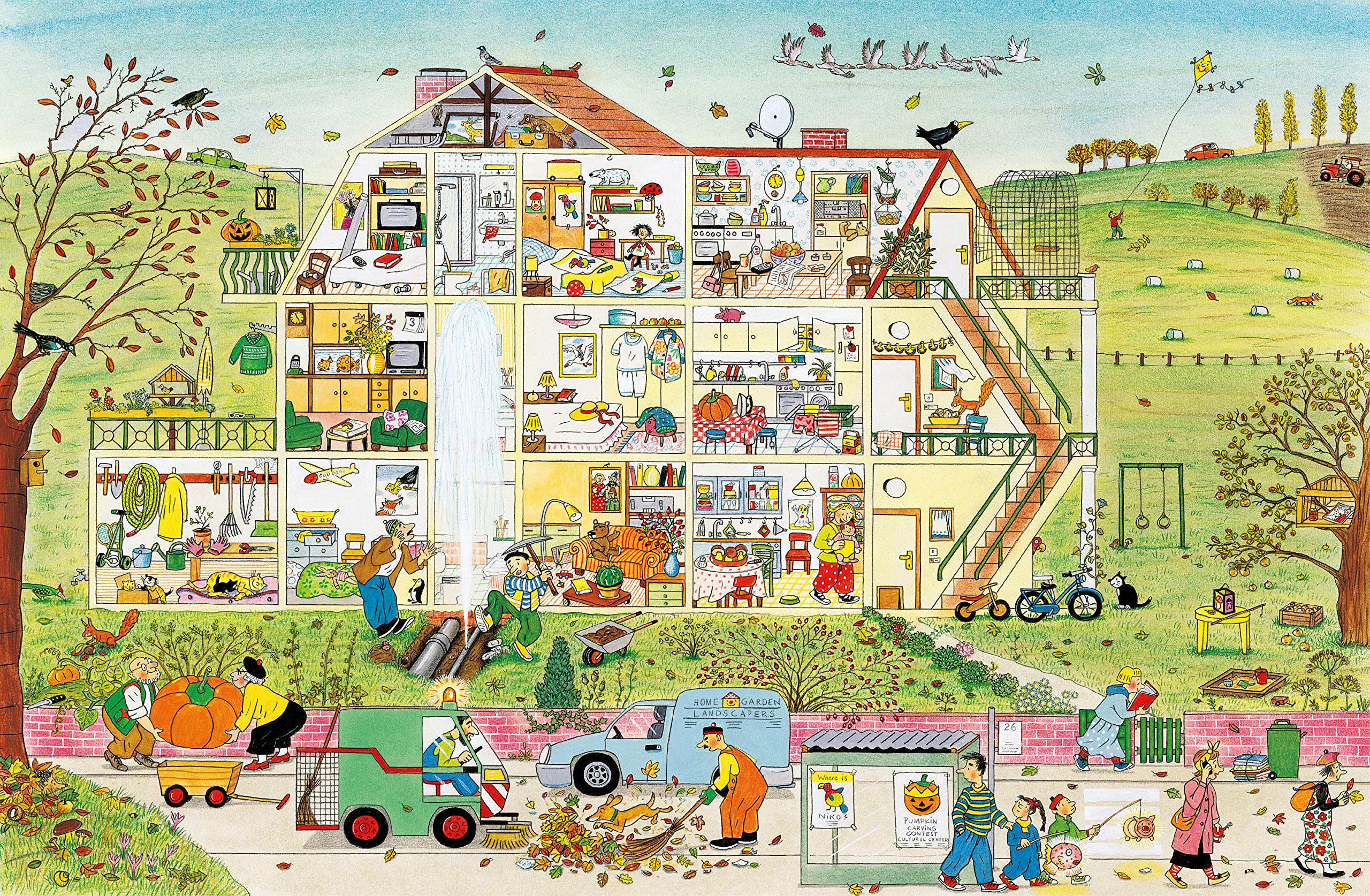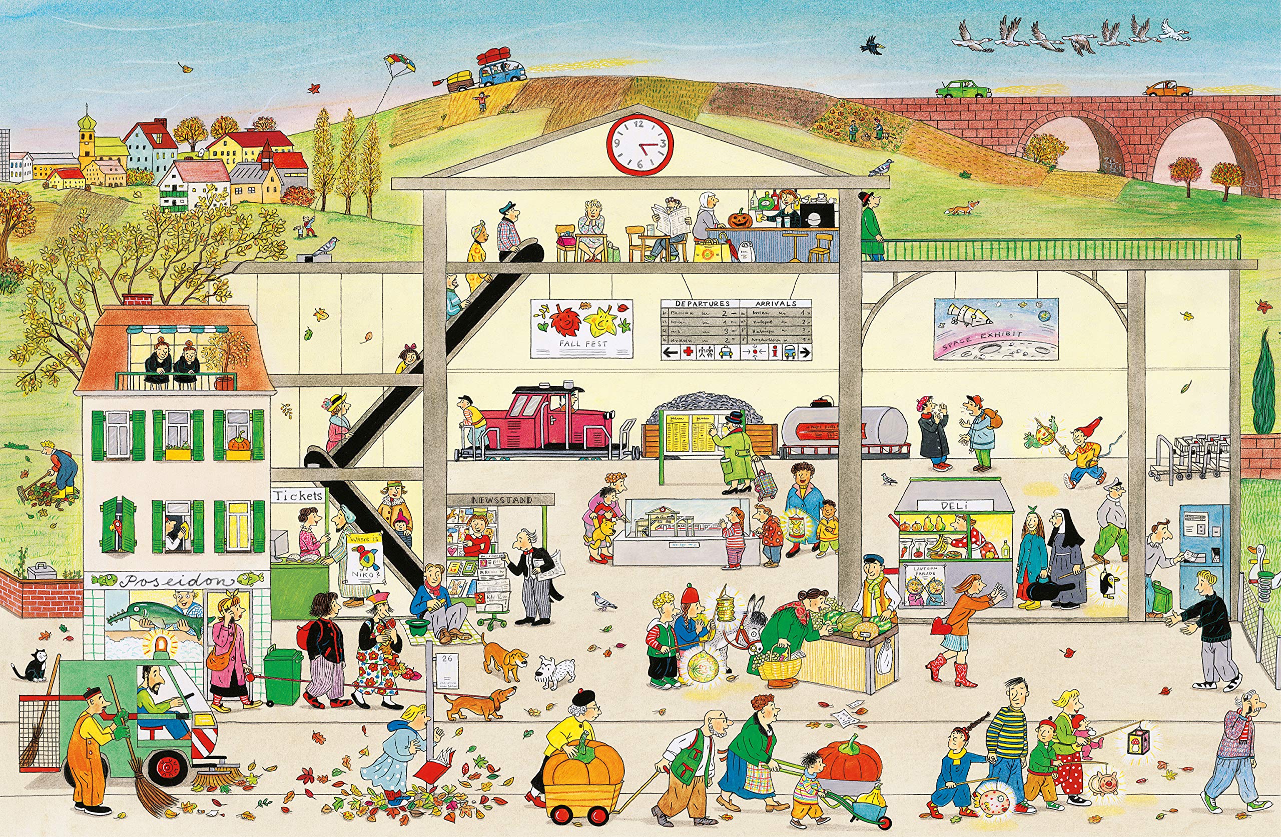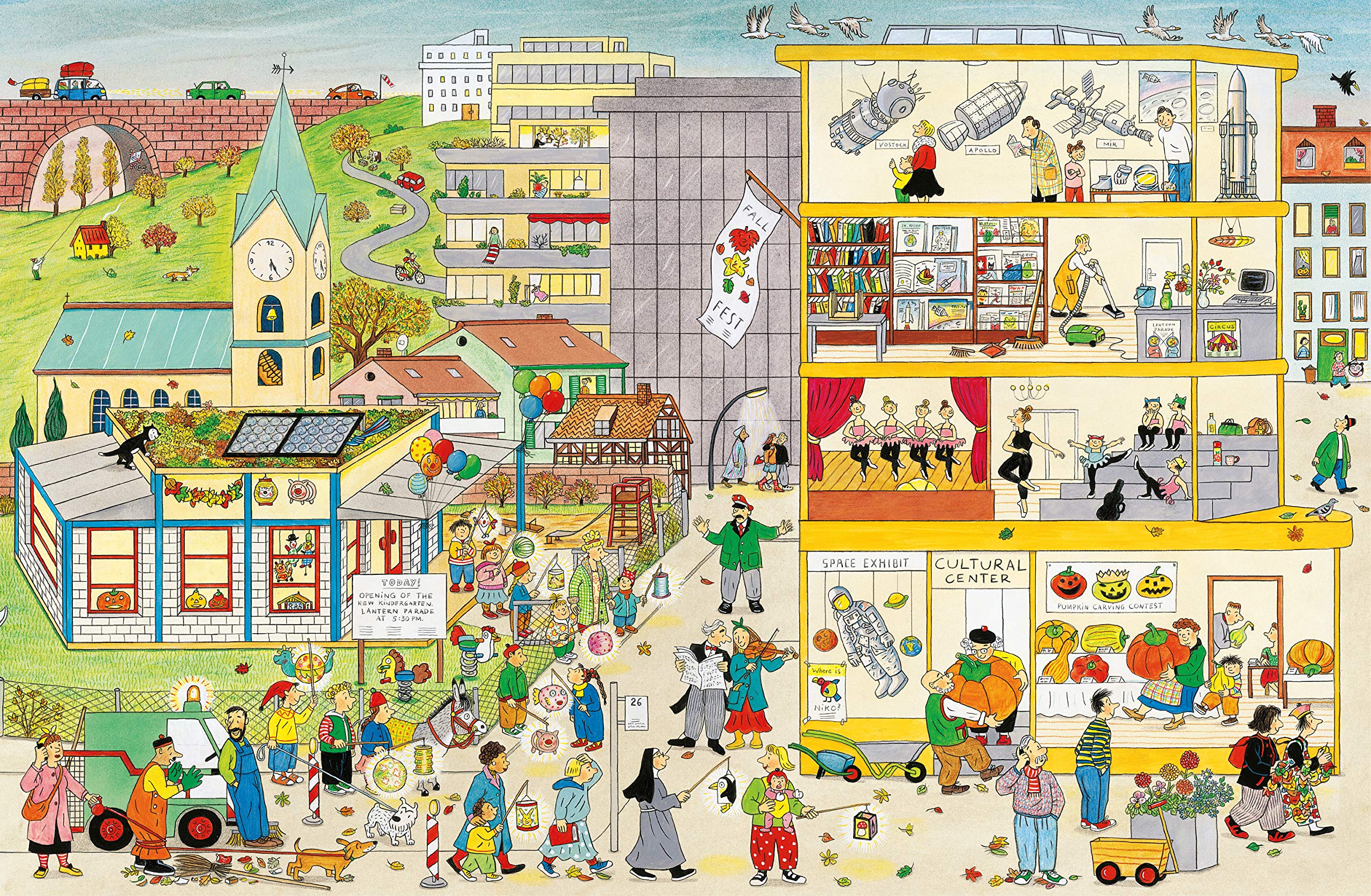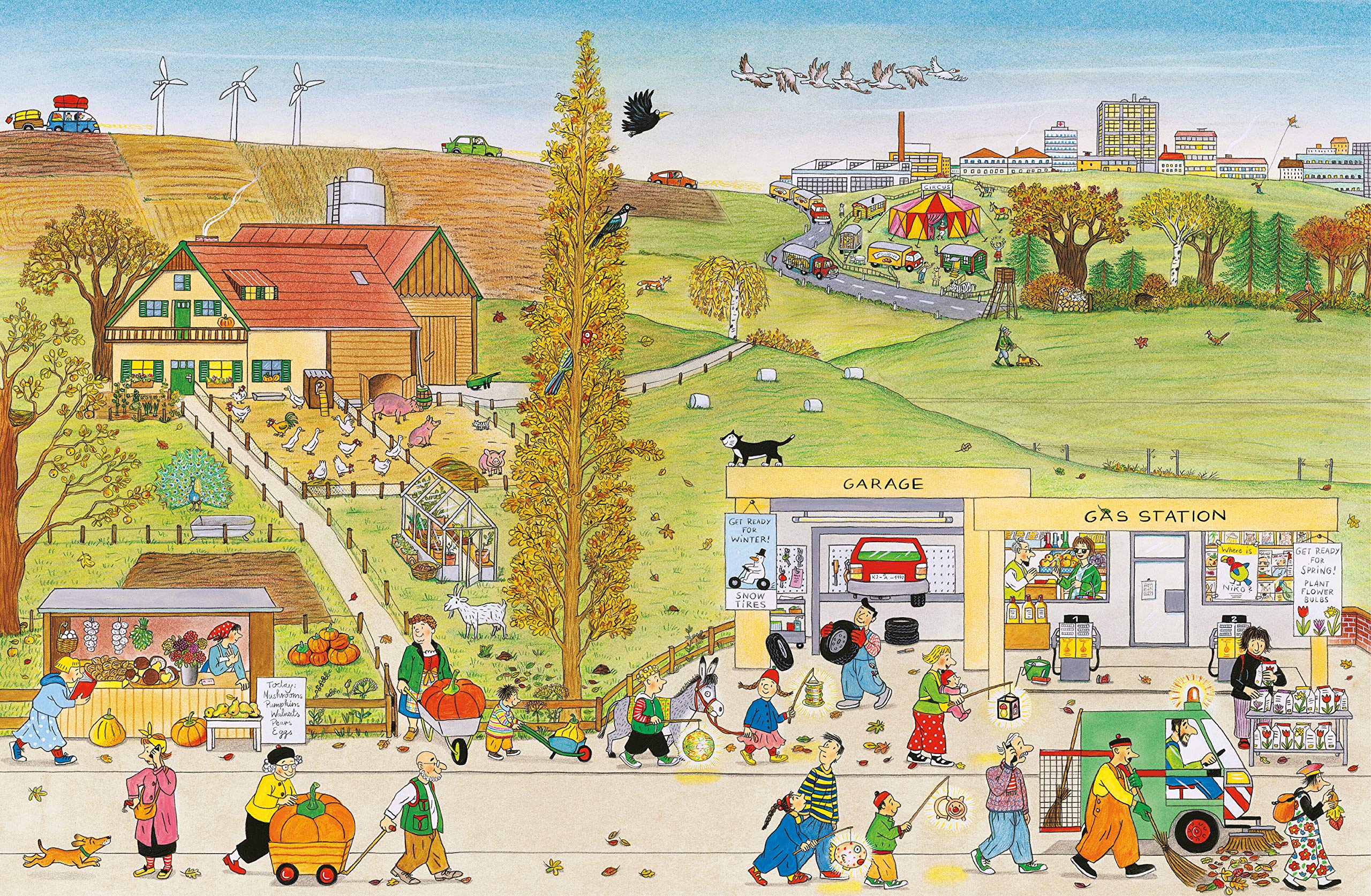 The leaves are blowing off the trees and the birds are flying south in Bustletown. Farmers are preparing the fields for winter and kids are back in school. And look, there's a water main break that's causing havoc and a chimney sweeper perched on a roof! Each time readers look at these delightfully detailed spreads they'll discover something new, whether it's what's for sale at the outdoor market or how many pumpkins they can spot on a single page. Familiar characters appear on each page - a maestro and a violinist, a balloon-toting nun, and a mum with her baby. All the activity culminates in a harvest celebration lit by dozens of paper lanterns in every shape and size. In the tradition of Richard Scarry and Where's Wally, this book encourages kids to return again and again to these charming spreads, following along with the characters and inventing their own stories. As they peruse scenes from the home to the farm, from the shopping center to the park, kids will enjoy identifying the different things that autumn brings.
