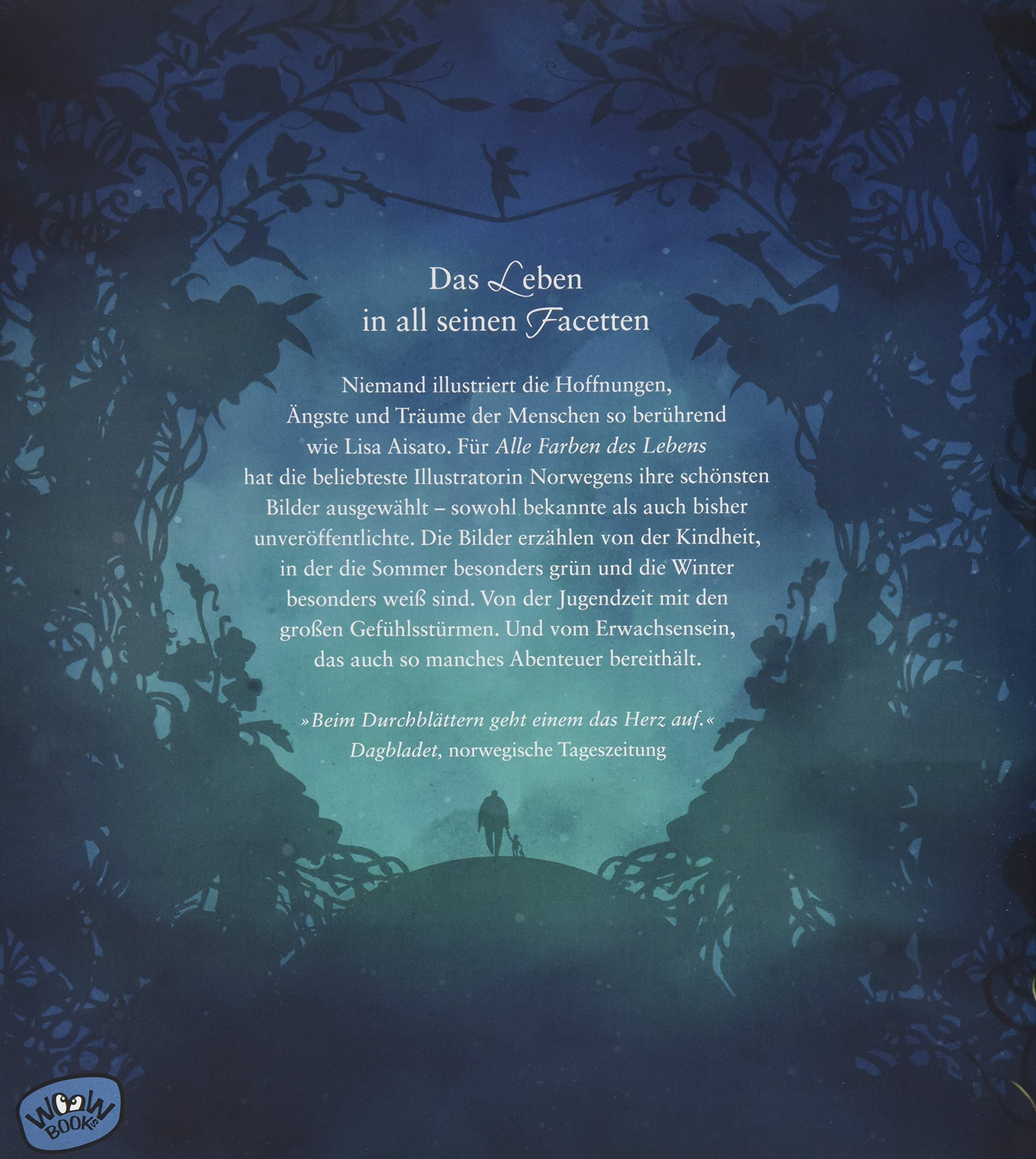 Niemand illustriert die Hoffnungen, Ängste und Träume der Menschen so berührend wie Lisa Aisato. Für 'Alle Farben des Lebens' hat sie ihre besten Bilder ausgewählt - sowohl Klassiker als auch bisher unveröffentlichte Illustrationen. Zusammen mit poetischen Sätzen begleiten sie uns durch das Leben. Sie erzählen von Liebe, Sorge und großer Freude. Von der Kindheit, in der die Sommer besonders grün und die Winter besonders weiß sind. Von der Jugendzeit mit den großen Gefühlsstürmen. Und vom Erwachsensein, das auch so manches Abenteuer bereithält.