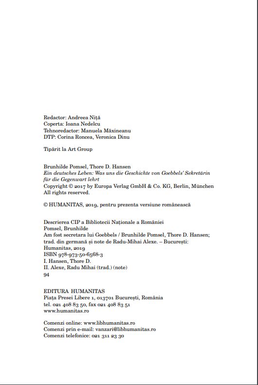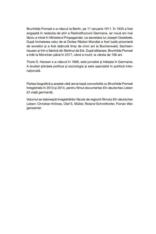 Acest volum se bazează pe convorbirile cu Brunhilde Pomsel înregistrate în 2013 și 2014, pentru filmul documentar Ein deutsches Leben (O viață germană), considerat una dintre cele mai importante contribuții la analiza Holocaustului.
