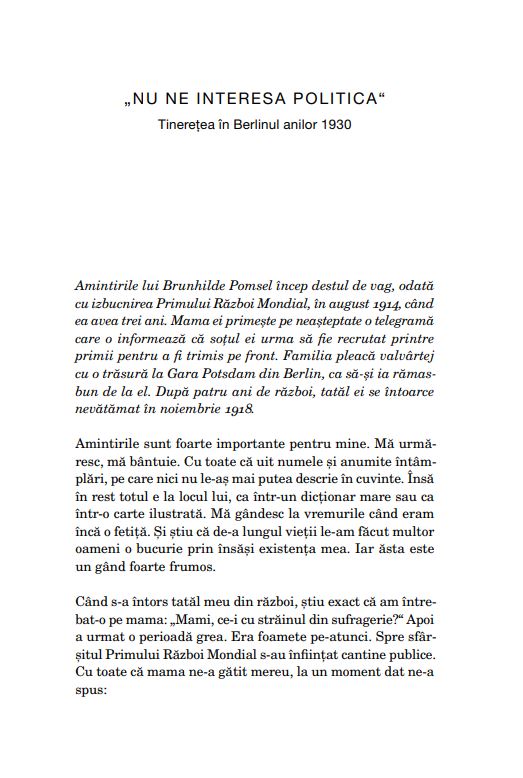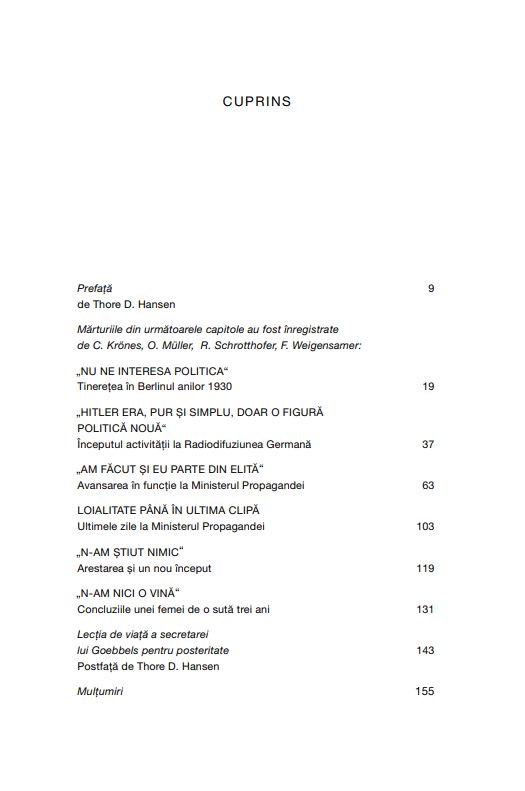 Brunhilde Pomsel a fost printre puținii care au reușit să ajungă în imediata apropiere a unuia dintre cei mai mari criminali din istorie. În Ministerul Propagandei, condus de Joseph Goebbels, a lucrat ca stenografă, dactilografă și secretară. Până la capitularea Berlinului, în mai 1945, a fost avansată și a ajuns în anticamera ministrului și-n mijlocul elitei conducătoare a național-socialismului. Chiar și în ultimele zile de război, când trupele sovietice se aflau deja pe străzile Berlinului, ea dactilografia acte oficiale și, în loc să găsească un moment prielnic ca să fugă, a fost cea care a cusut steagul capitulării. Mai bine de șapte decenii n-a vorbit cu nimeni despre toate acestea.