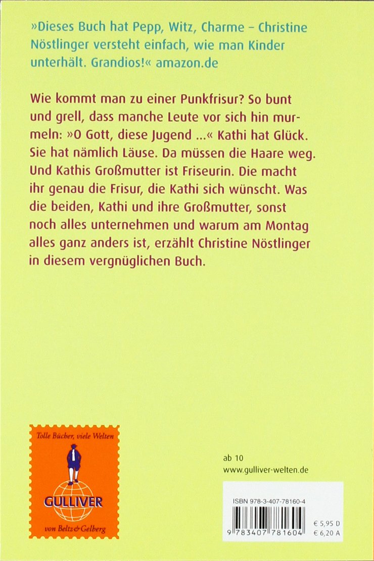 Wie kommt man zu einer Punkfrisur? So bunt und grell, dass manche Leute vor sich hinmurmeln: »Oh Gott, diese Jugend von heute ...« Kathi hat Glück. Kathi hat nämliche Läuse. Da müssen die langen Haare weg. Und Kathis Großmutter ist Friseuse. Die macht genau die Frisur, die sich Kathi wünscht. Was die beiden sonst noch unternehmen und warum am Montag alles ganz anders ist, steht in diesem humorvollen Buch.