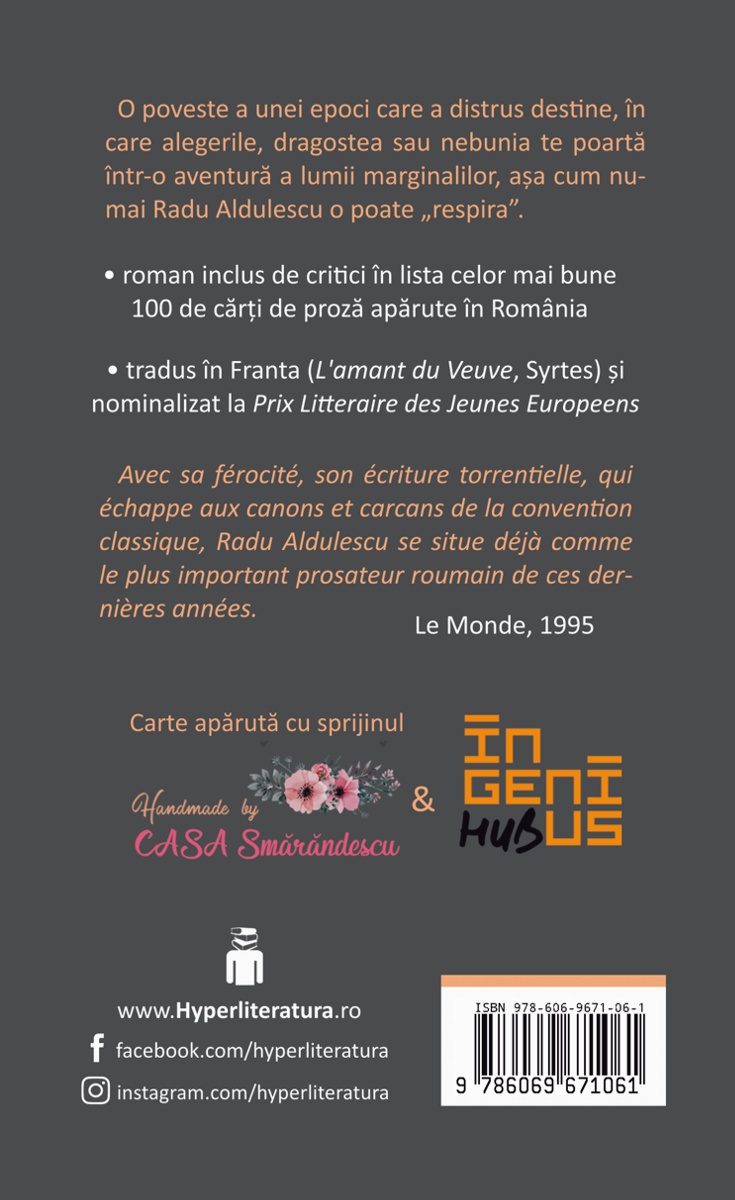 O poveste a unei epoci care a distrus destine, în care alegerile, dragostea sau nebunia te poartă într-o aventură a lumii marginalilor, așa cum numai Radu Aldulescu o poate „respira”.