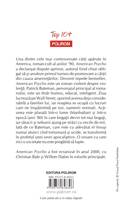 Una dintre cele mai controversate carti aparute in America, roman-cult al anilor ’90, American Psycho a declansat dispute aprinse, autorul fiind chiar obligat sa-si anuleze primul turneu de promovare a cartii din cauza amenintarilor. Devenit repede bestseller, American Psycho este un roman violent despre violenta. Patrick Bateman, personajul principal al romanului, este un tinar frumos, educat, inteligent. Ziua lucreaza pe Wall Street, sporind averea deja considerabila a familiei lui, iar noaptea se ocupa cu lucruri care ne inspaiminta pe noi, oamenii normali. Actiunea este plasata intr-o lume (Manhattan) si intr-o epoca (anii ’80) in care bogatii devin tot mai bogati, iar saracii si nebunii ajung pe strazi cu zecile de mii. Iata de ce Bateman, care este cu adevarat el insusi numai atunci cind tortureaza si ucide, se transforma in profetul unei orori apocaliptice. O oroare cu care nici o societate nu este pregatita sa lupte.