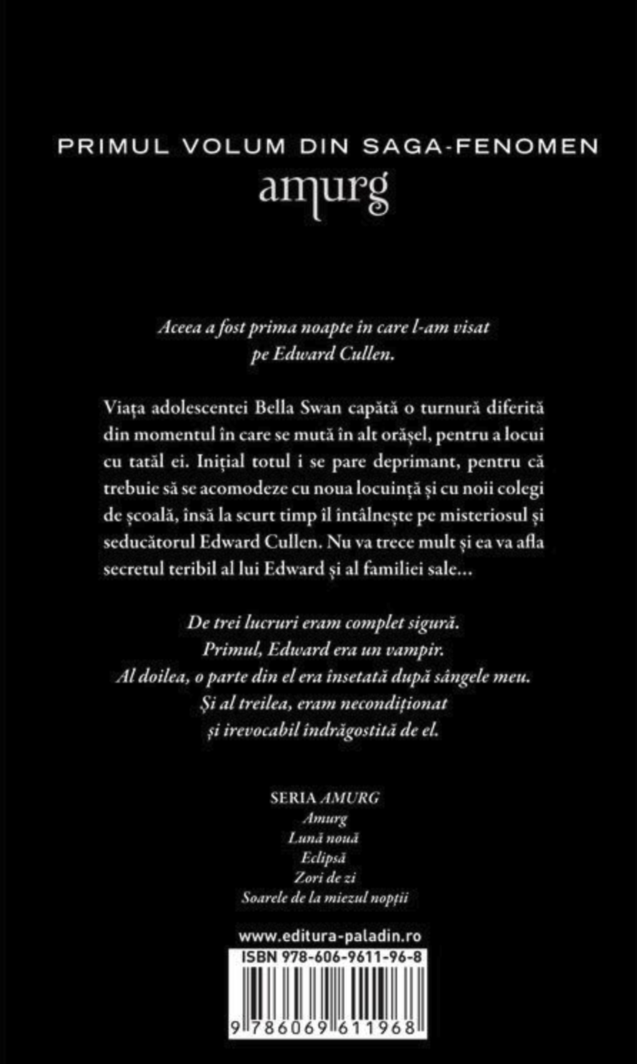 „Suspansul idilei dintre o adolescentă și un vampir, care a dat naștere unui «fenomen literar» și a redefinit romanul de dragoste pentru o generație.“ -- New York Times