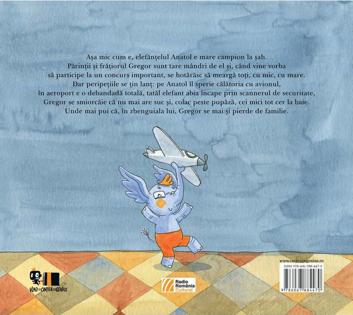 Așa mic cum e, elefănțelul Anatol e mare campion la șah. Părinții și frățiorul Gregor sunt tare mândri de el, și când vine vorba să participe la un concurs important, se hotărăsc să meargă toți, cu mic, cu mare. Dar peripețiile se țin lanț: pe Anatol îl sperie călătoria cu avionul, în aeroport e o debandadă totală, tatăl elefant abia încape prin scannerul de securitate, Gregor se smiorcăie că nu mai are suc și, colac peste pupăză, cei mici tot cer la baie. Unde mai pui că, în zbenguiala lui, Gregor se mai și pierde de familie.