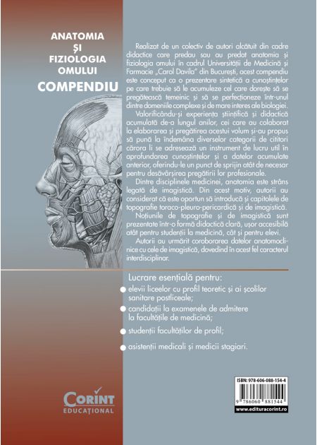 Realizat de un colectiv de autori alcătuit din cadre didactice care predau sau au predat anatomia și fiziologia omului în cadrul Universității de Medicină și Farmacie„ Carol Davila” din București, acest compendiu este conceput ca o prezentare sintetică a cunoștințelor pe care trebuie să le acumuleze cel ce dorește să se pregătească serios și să se perfecționeze într-unul dintre domeniile complexe și de mare interes ale biologiei.
