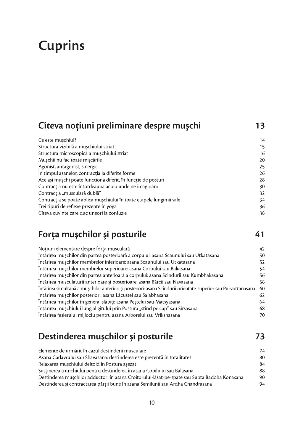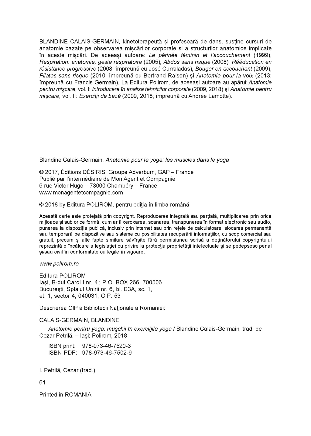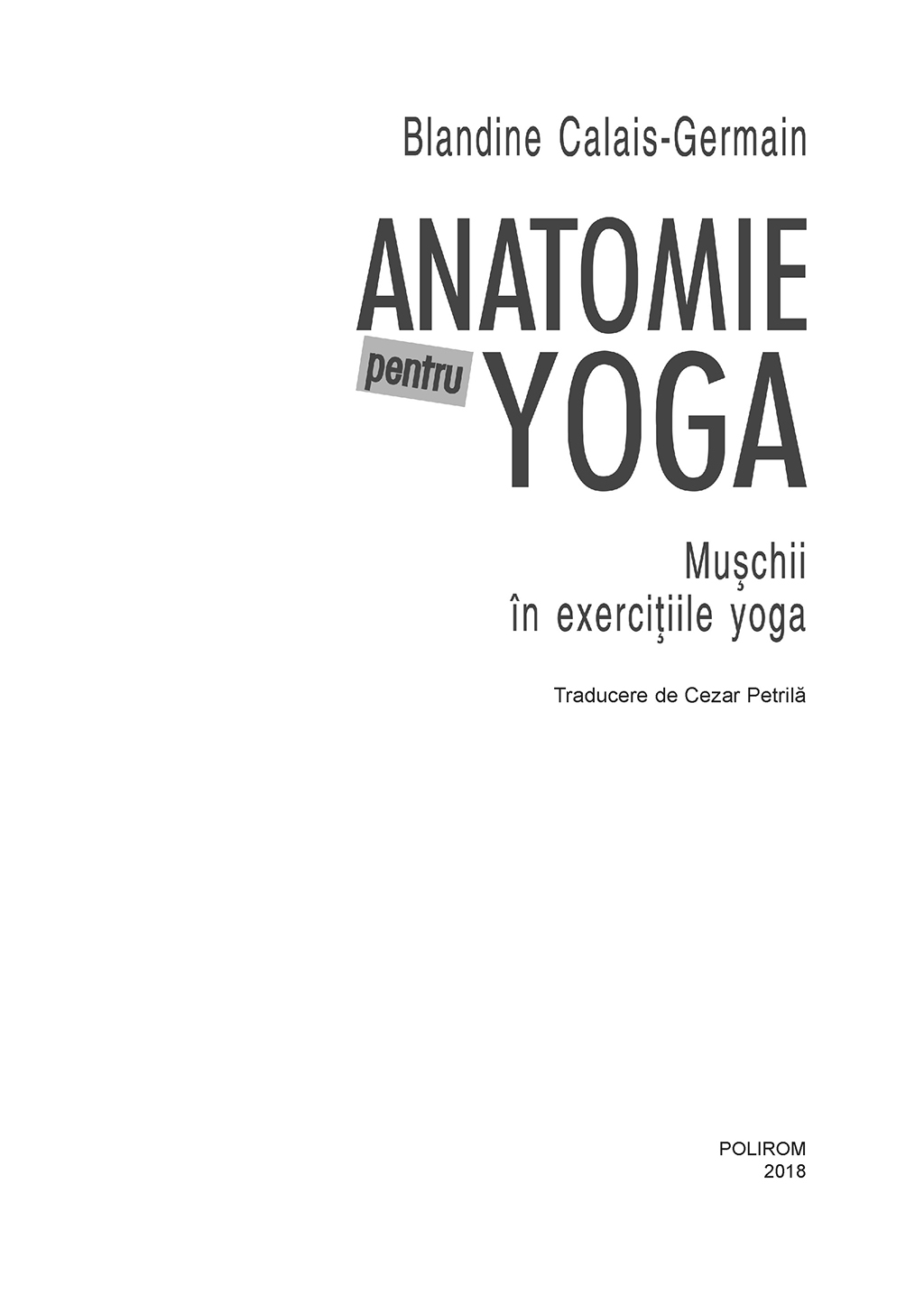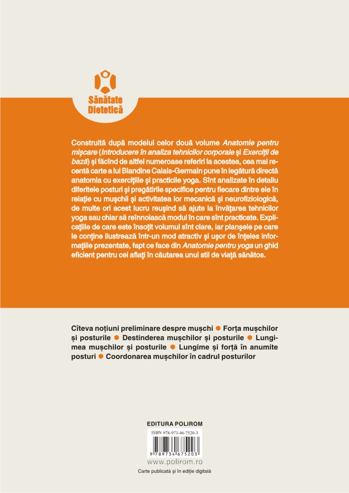 Construită după modelul celor două volume Anatomie pentru mişcare (Introducere în analiza tehnicilor corporale şi Exerciţii de bază) şi făcînd de altfel numeroase referiri la acestea, cea mai recentă carte a lui Blandine Calais-Germain pune în legătură directă anatomia cu exerciţiile şi practicile yoga. Sînt analizate în detaliu diferitele posturi şi pregătirile specifice pentru fiecare dintre ele în relaţie cu muşchii şi activitatea lor mecanică şi neurofiziologică, de multe ori acest lucru reuşind să ajute la învăţarea tehnicilor yoga sau chiar să reînnoiască modul în care sînt practicate. Explicaţiile de care este însoţit volumul sînt clare, iar planşele pe care le conţine ilustrează într-un mod atractiv şi uşor de înţeles informaţiile prezentate, fapt ce face din Anatomie pentru yoga un ghid eficient pentru cei aflaţi în căutarea unui stil de viaţă sănătos.