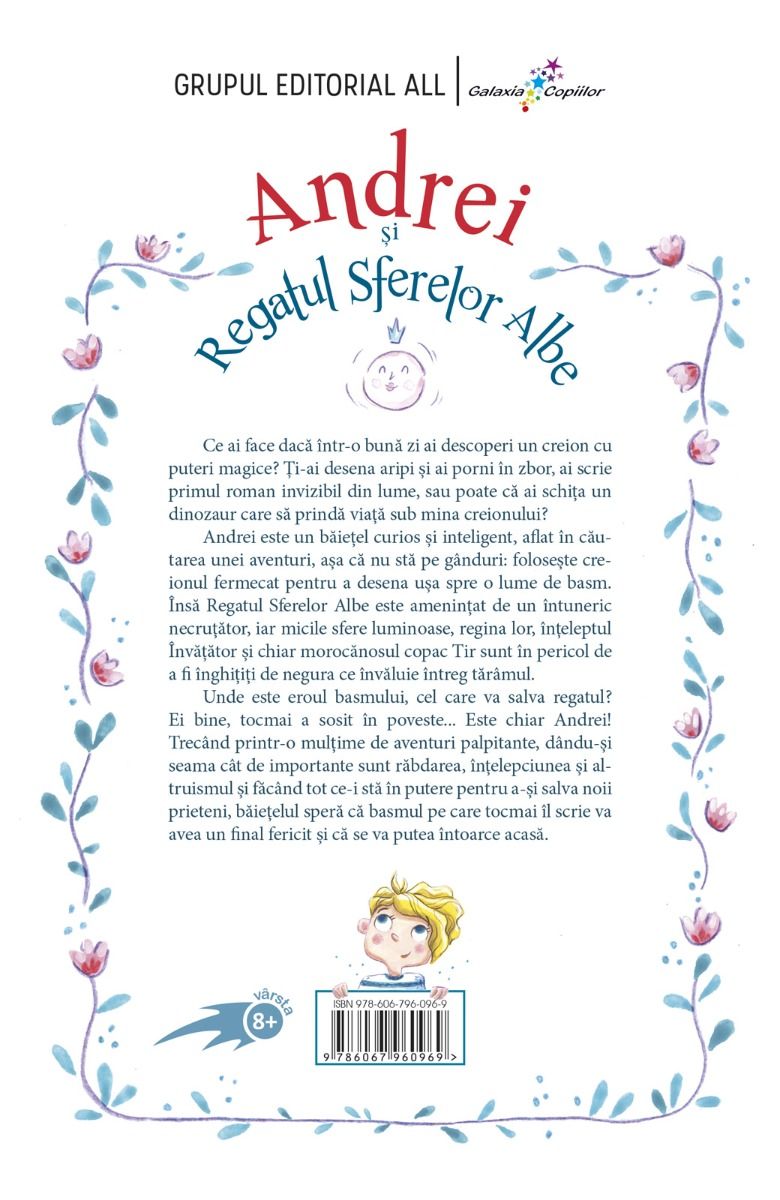 Dintr-odată, universului cunoscut i-a luat locul o cameră întunecată și apăsătoare. Asta până a găsit un alt obiect misterios: creionul cu puteri magice. Cu ajutorul lui, Andrei a desenat ușa spre o lume de basm. Întâmplările care se conturează aici îi împlinesc în cel mai neașteptat mod cu putință dorul de aventură. Băiatul care mai devreme se lupta cu dezordinea din dormitor a devenit între timp erou de basm. Iar odată cu noul lui statut vine și o responsabilitate imensă: trebuie să salveze Regatul Sferelor Albe de întunericul necruțător care îl năpădește treptat.