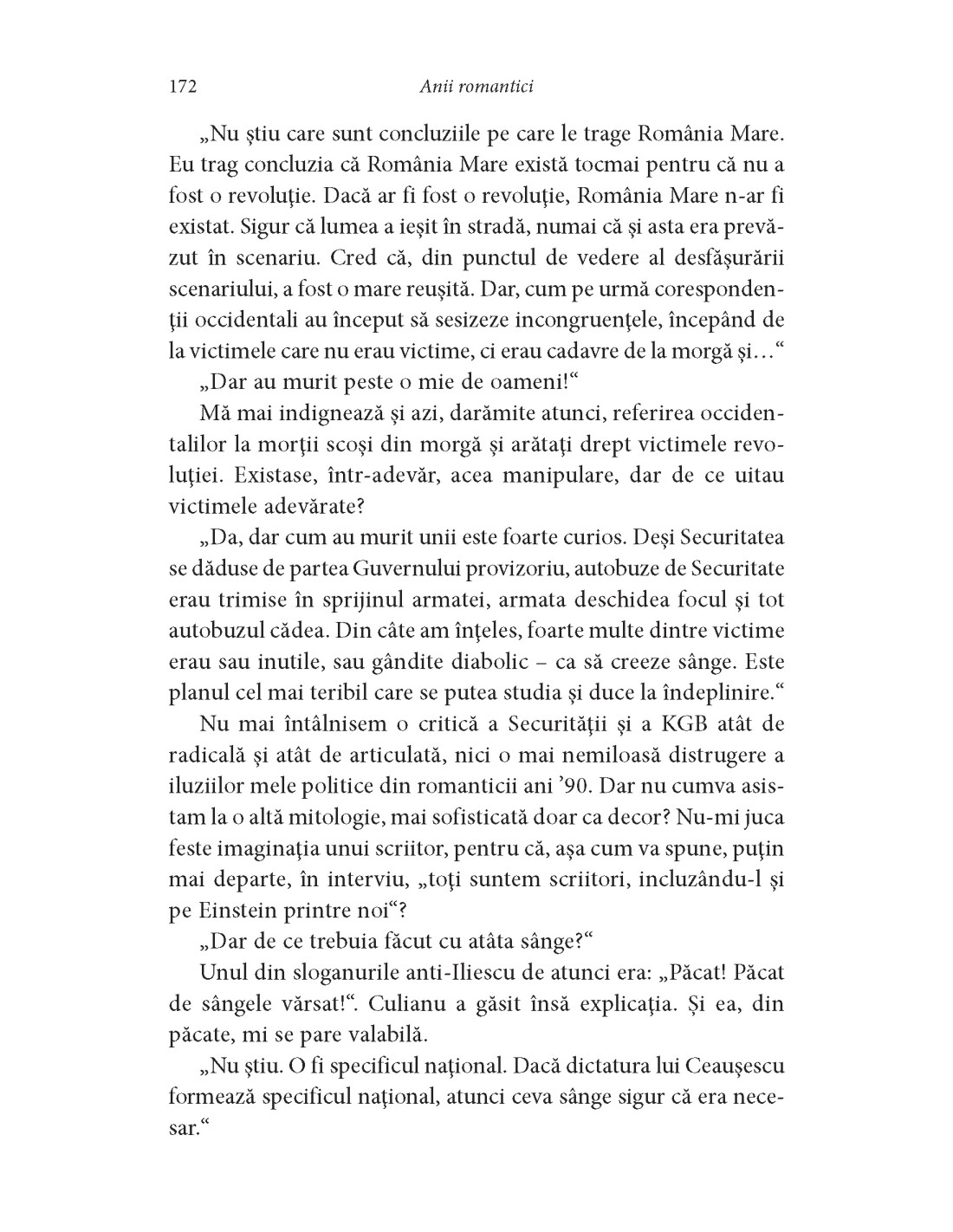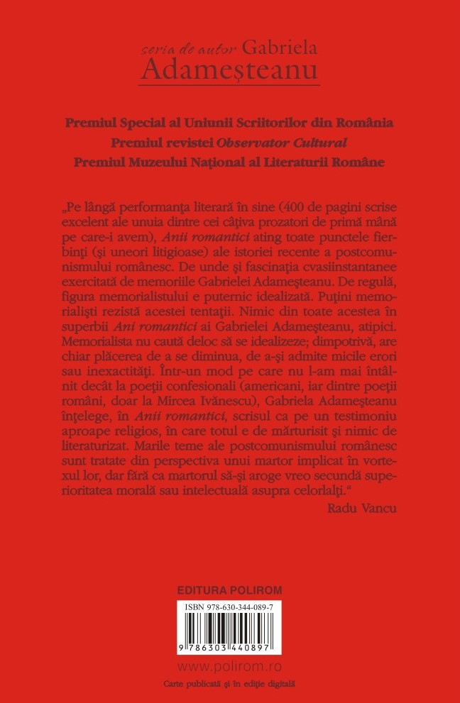 „Pe lângă performanța literară în sine (400 de pagini scrise excelent ale unuia dintre cei câțiva prozatori de primă mână pe care-i avem), Anii romantici ating toate punctele fierbinți (și uneori litigioase) ale istoriei recente a postcomunismului românesc. De unde și fascinația cvasiinstantanee exercitată de memoriile Gabrielei Adameșteanu. De regulă, figura memorialistului e puternic idealizată. Puțini memorialiști rezistă acestei tentații. Nimic din toate acestea în superbii Ani romantici ai Gabrielei Adameșteanu, atipici. Memorialista nu caută deloc să se idealizeze; dimpotrivă, are chiar plăcerea de a se diminua, de a-și admite micile erori sau inexactități. Într-un mod pe care nu l-am mai întâlnit decât la poeții confesionali (americani, iar dintre poeții români, doar la Mircea Ivănescu), Gabriela Adameșteanu înțelege, în Anii romantici, scrisul ca pe un testimoniu aproape religios, în care totul e de mărturisit și nimic de literaturizat. Marile teme ale postcomunismului românesc sunt tratate din perspectiva unui martor implicat în vortexul lor, dar fără ca martorul să-și aroge vreo secundă superioritatea morală sau intelectuală asupra celorlalți.” (Radu Vancu)