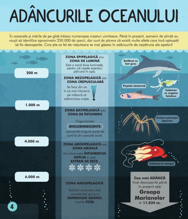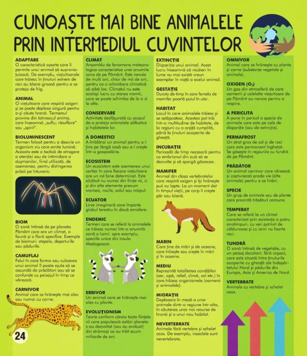 Prin această carte îți punem la dispoziție o colecție de date și de informații fascinante despre lumea animalelor – de la lanțuri trofice, la specii în pericol de dispariție –, care cu siguranță îți vor stârni curiozitatea. Vei descoperi de ce insulele izolate adăpostesc specii unice, unde trăiesc cele mai rapide viețuitoare și cât de adânc pot pătrunde în apă straniile creaturi oceanice. Ce vei învăța acum citind această carte îți va rămâne în minte pentru toată viața.