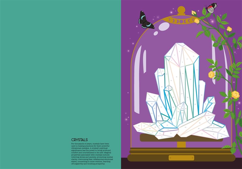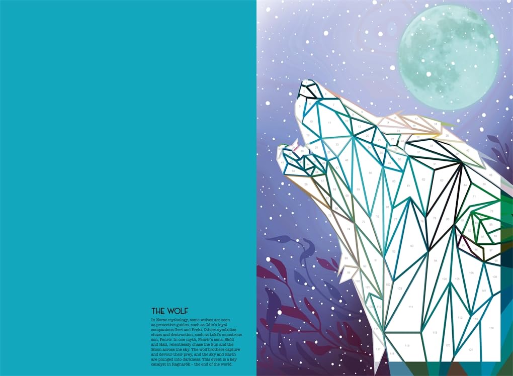 The numbered shapes on each page can be filled with corresponding stickers to create impactful, mosaic-style artworks. From a kitsune poised against a cherry blossom backdrop, to a mystical crystal ball, readers can reveal each stunning image as they complete their magical masterpieces. Each image is accompanied with short descriptive text on the facing page, to explain the animal or object’s significance in myth and magic.