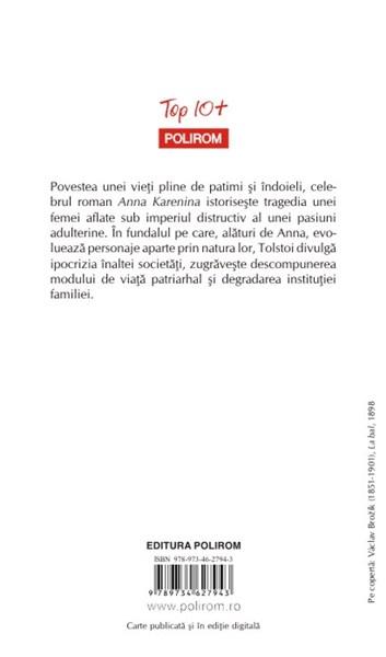 Povestea unei vieti pline de patimi si indoieli, celebrul roman Anna Karenina istoriseste tragedia unei femei aflate sub imperiul distructiv al unei pasiuni adulterine. In fundalul pe care, alaturi de Anna, evolueaza personaje aparte prin natura lor, Tolstoi divulga ipocrizia inaltei societati, zugraveste descompunerea modului de viata patriarhal si degradarea institutiei familiei.