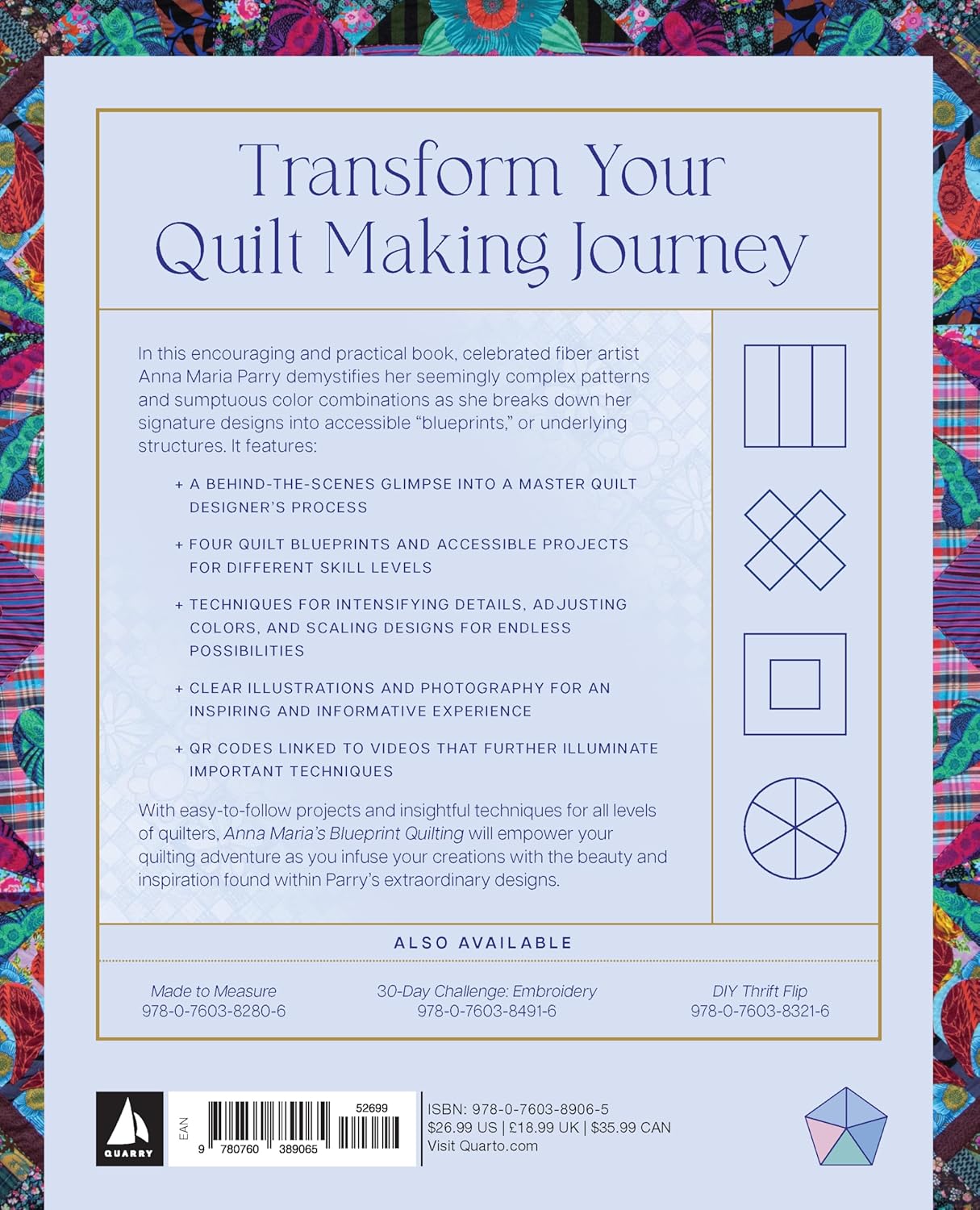 Uncover the mystery of quilt design with Anna Maria's Blueprint Quilting. Celebrated fiber artist Anna Maria Parry demystifies her seemingly complex patterns and sumptuous color combinations as she breaks down her signature designs into accessible "blueprints," or underlying structures. This accessible, visually inspiring book features: