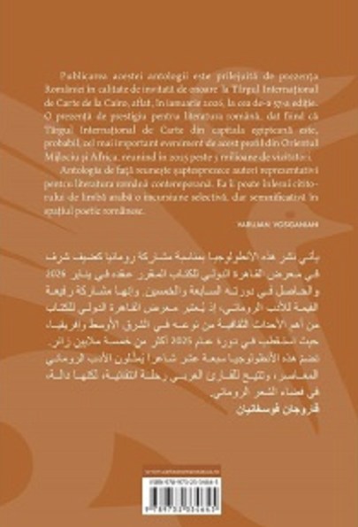 Publicarea acestei antologii este prijeluită de prezența României în calitate de invitată de onoare la Târgul Internațional de Carte de la Cairo, aflat, în ianuarie 2026, la cea de-a 57-a ediție. O prezență de prestigiu pentru literatura română, dat fiind că Târgul Internațional de Carte din capitala egipteană este, probabil, cel mai important eveniment de acest profil din Orientul Mijlociu și Africa, reunind în 2025 peste 5 milioane de vizitatori. Antologia de față reunește șaptesprezece autori reprezentativi pentru literatura română contemporană. Ea îi poate înlesni cititorului de limbă arabă o incursiune selectivă, dar semnificativă în spațiul poetic românesc.