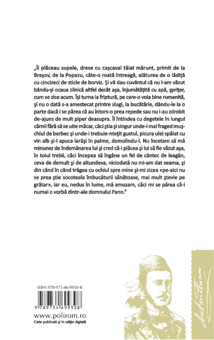„Îi plăceau supele, drese cu caşcaval tăiat mărunt, primit de la Braşov, de la Popazu, câte-o roată întreagă, alăturea de o lădiţă cu cincizeci de sticle de borviz. Şi vă dau cuvântul că nu l-am văzut bându-şi ocaua zilnică altfel decât aşa, înjumătăţită cu apă, şpriţer, cum se zice acum. Îşi turna la friptură, pe care-o voia bine rumenită, şi nu o dată s-a amestecat printre slugi, la bucătărie, dându-le la o parte dacă i se părea că au întors-o prea repede sau nu i-au zdrobit de-ajuns de mult piper deasupra.