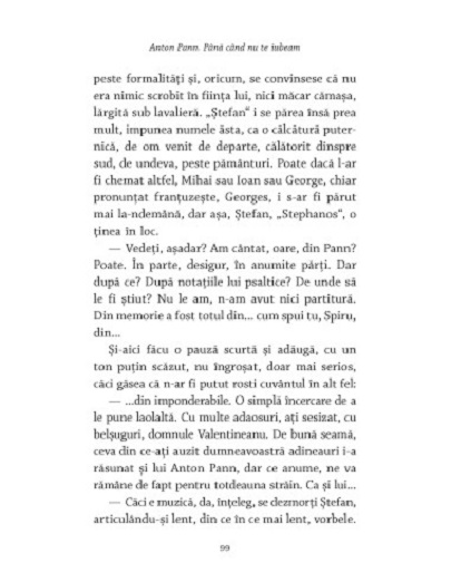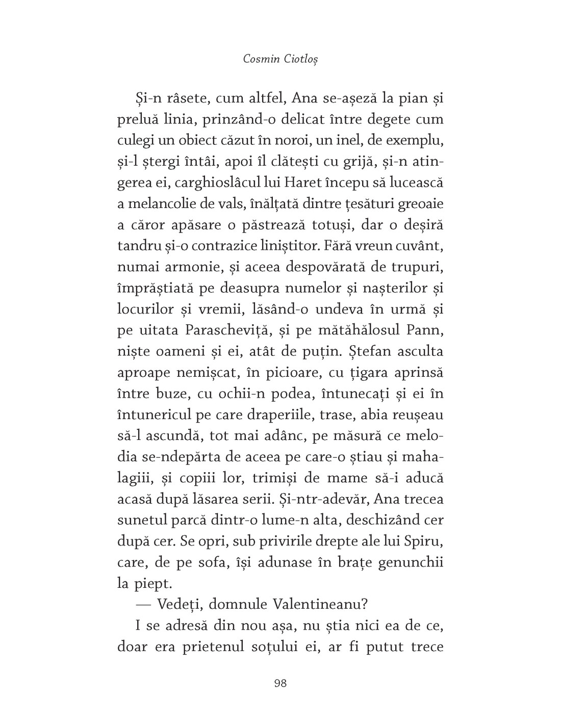 Îl întindea cu degetele în lungul cărnii fără să se uite măcar, căci ştia şi singur unde-i mai fraged muşchiul de berbec şi unde-i trebuie-nteţit gustul, picura ulei spălat cu vin alb şi-l apuca iarăşi în palme, domolindu-l. Nu încetam să mă minunez de îndemânarea lui şi cred că-i plăcea şi lui să fie văzut aşa, în toiul trebii, căci începea să îngâne un fel de cântec de leagăn, ceva de demult şi de altundeva, niciodată nu mi-am dat seama, şi din când în când trăgea cu ochiul spre mine şi-mi zicea «pe-aici nu se prea ştie socoteala îmbucăturii sănătoase, mai mult ştevie pe grătar», iar eu, nedus în lume, mă amuzam, căci mi se părea că-i numai o vorbă dintr-ale domnului Pann.”