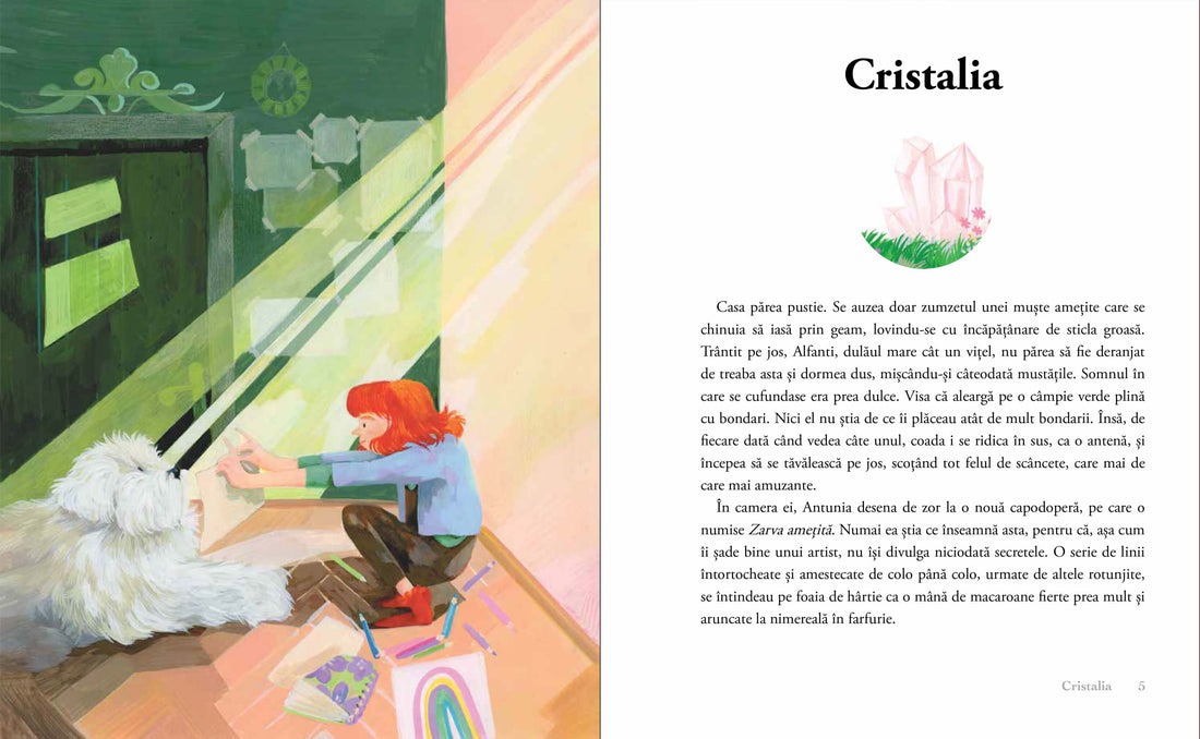 Pe urmele unui cățel zăpăcit, Alfanti, care o ia la fugă prin pădure, fetița Antunia ajunge la o casă misterioasă, iar de acolo în... Cristalia, minunata lume magică a piticilor care au uitat să pună întrebări.
