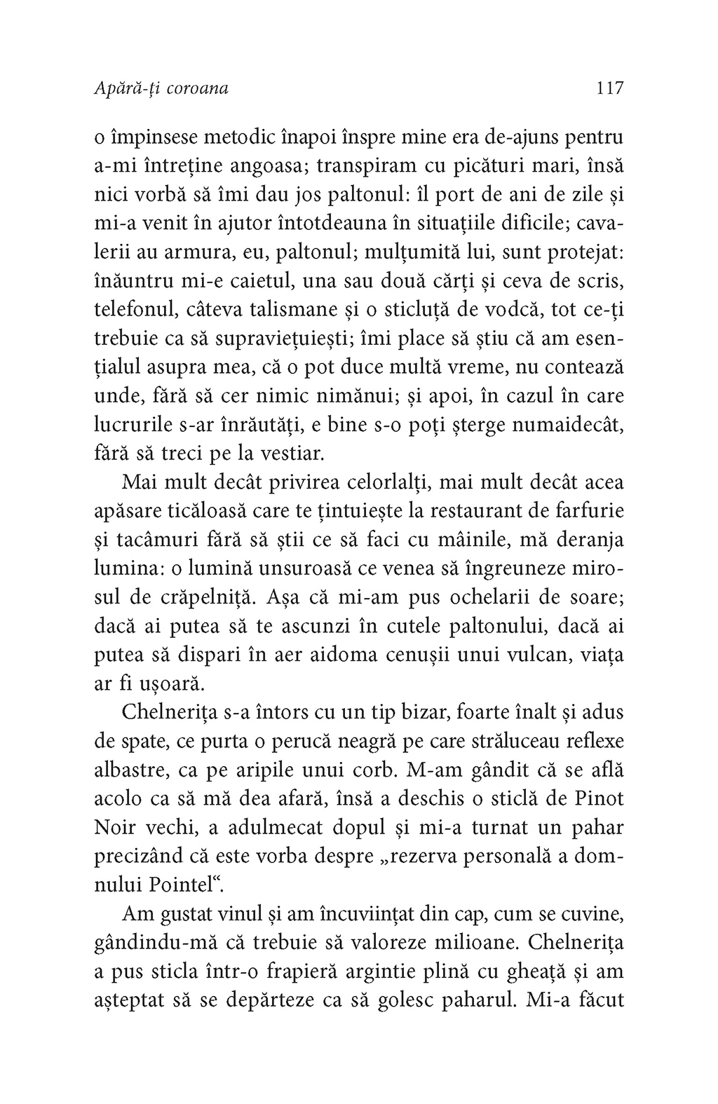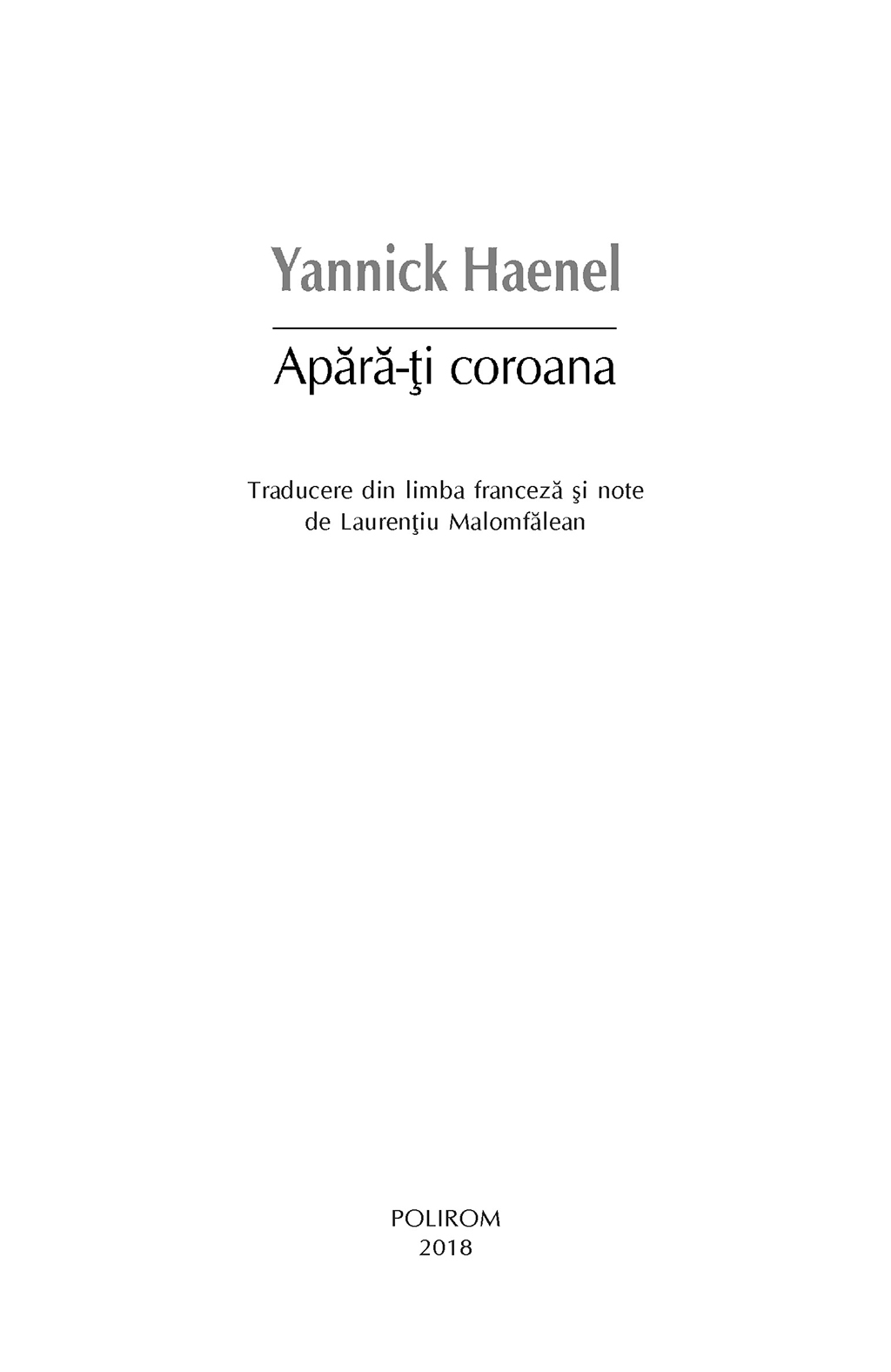 Un bărbat scrie un scenariu stufos despre viaţa lui Herman Melville, dar nici un producător nu e interesat să-l transforme în film. Într-o zi cineva îi face rost de numărul de telefon al marelui regizor american Michael Cimino, producătorul celebru al filmelor The Deer Hunter şi Heaven’s Gate. Se întîlnesc la New York, unde Cimino îi citeşte manuscrisul. Romanul descrie o serie de aventuri rocamboleşti desfăşurate între Muzeul Vînătorii şi al Naturii, în Paris, Ellis Island, în New York, şi Lacul Nemi, în Italia. Trecînd dintr-un spaţiu într-altul, o cunoaştem pe Isabelle Huppert, dăm peste zeiţa Diana, un dalmaţian pe nume Sabbat, un vecin demonic, peste doi mustăcioşi suspecţi, o studentă la doctorat, o portăreasă perfidă şi un şef de sală foarte agresiv, ce pare o sosie a lui Emmanuel Macron. Povestea incredibilă şi subtilă a romanului Apără-ţi coroana, un titlu ca un îndemn biblic ce l-a inspirat cîndva pe Proust, construieşte o punte între cinema şi literatură într-o manieră încîntătoare şi totodată pătrunzătoare. Spectacolul vieţii noastre ascunde o poveste sacră: romanul lui Yannick Haenel se află în căutarea ei.