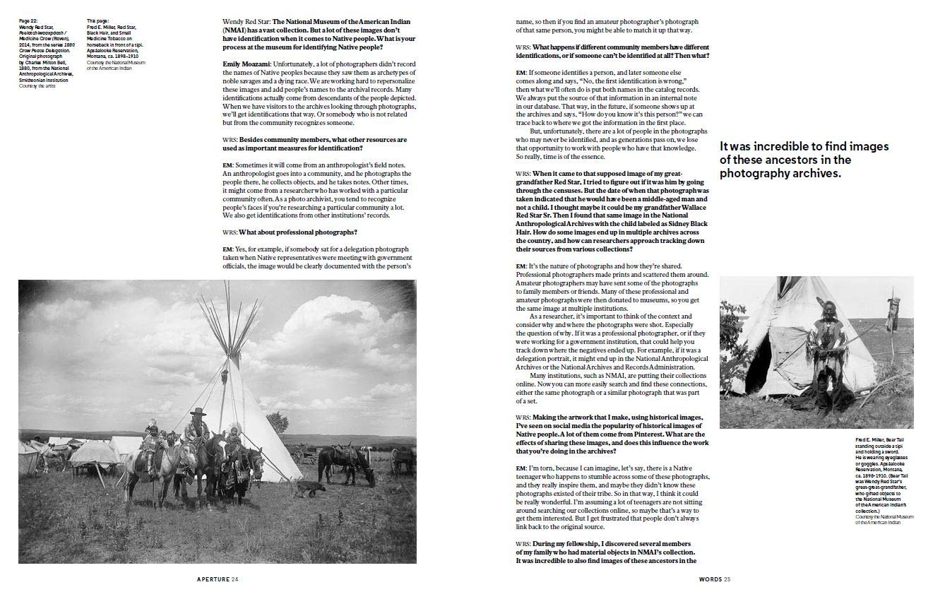 The Native America issue, edited in collaboration with the artist Wendy Red Star, considers the wide-ranging work of photographers and lens-based artists who are posing challenging questions about land rights, narratives of identity and heritage, and histories of colonialism at a moment when debates around nationalism and borders in North America are deeply contested. With contributions by Indigenous photographers, scholars, writers, and curators―including Rebecca Belmore, Natalie Diaz, Martine Gutierrez, Duane Linklater, Terese Marie Mailhot, Wanda Nanibush, Julian Brave NoiseCat, and Tommy Pico―the issue will look into the historic, often fraught relationship between photography and Native representation, while also offering new perspectives by emerging artists who are engaged with defining what it means to be a citizen in North America today.