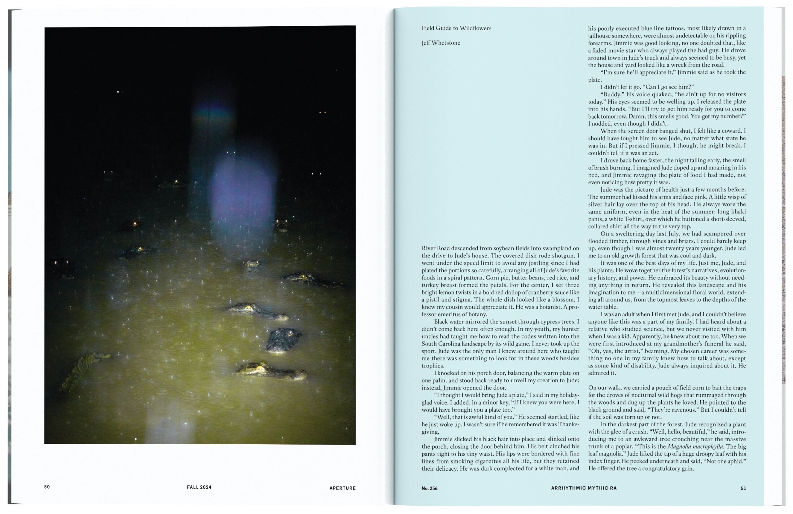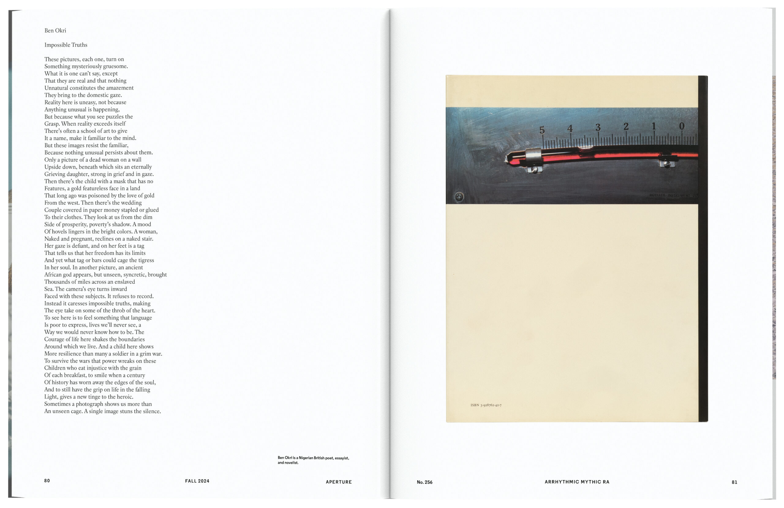 The issue coincides with Poetic Record: Photography in a Transformed World, an exhibition and two-day symposium at Princeton University, where Lawson is the Dorothy Krauklis ’78 Professor of Visual Arts. The exhibition is curated by Lawson and Famighetti, and the symposium is organized by Lawson in collaboration with Princeton colleagues Jeff Whetstone and James Welling at the Hurley Gallery, Lewis Center for the Arts. The show, on view from October 1 to December 5, 2024, includes work by many photographers featured in “Arrhythmic Mythic Ra.” The symposium takes place from October 10 to 11.