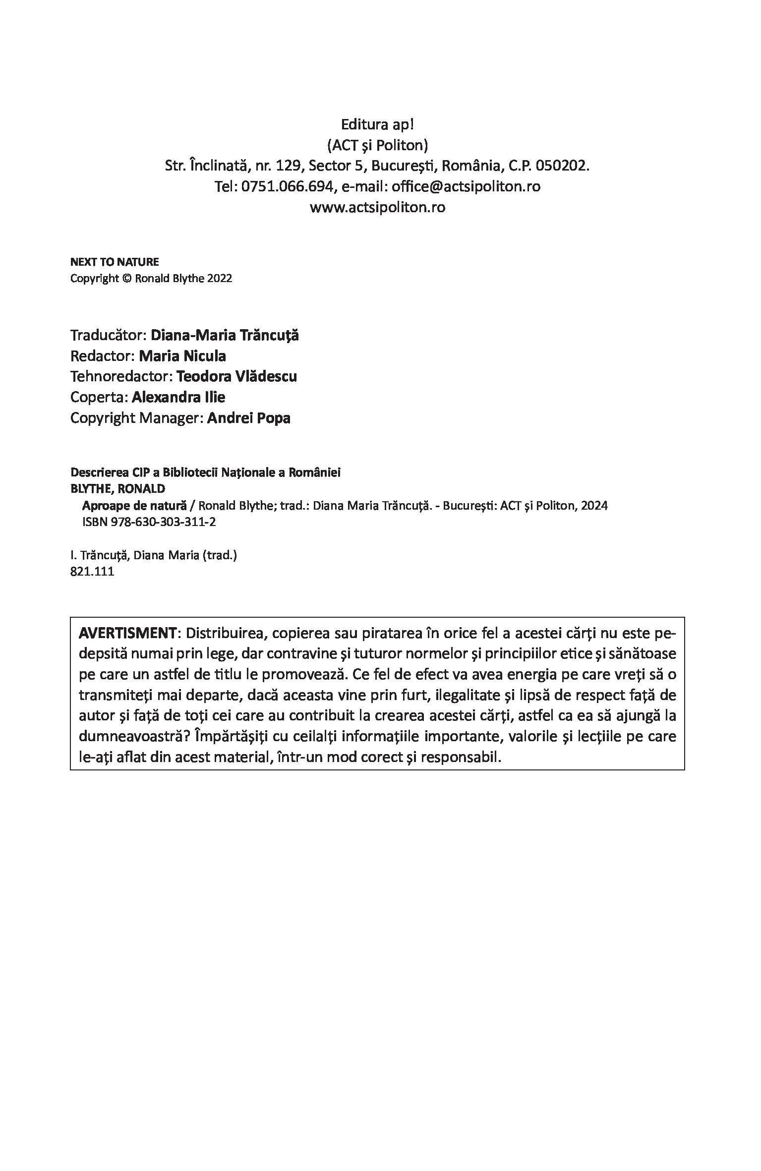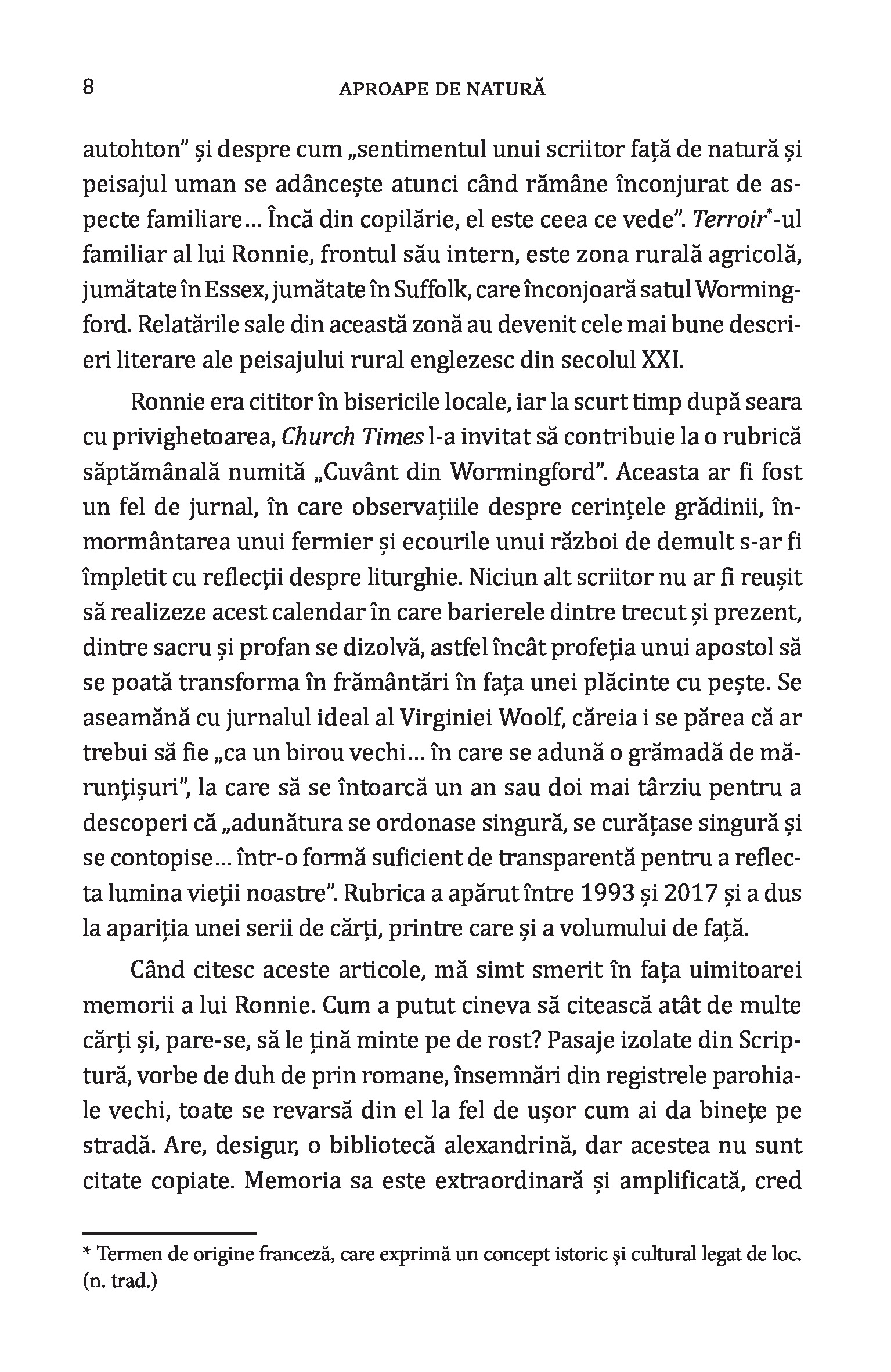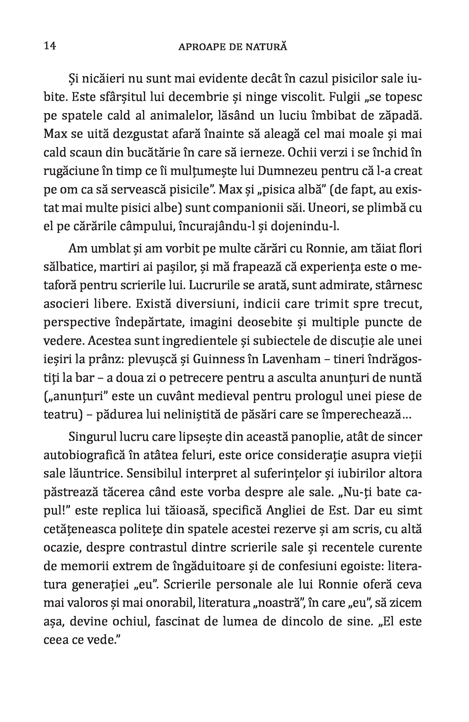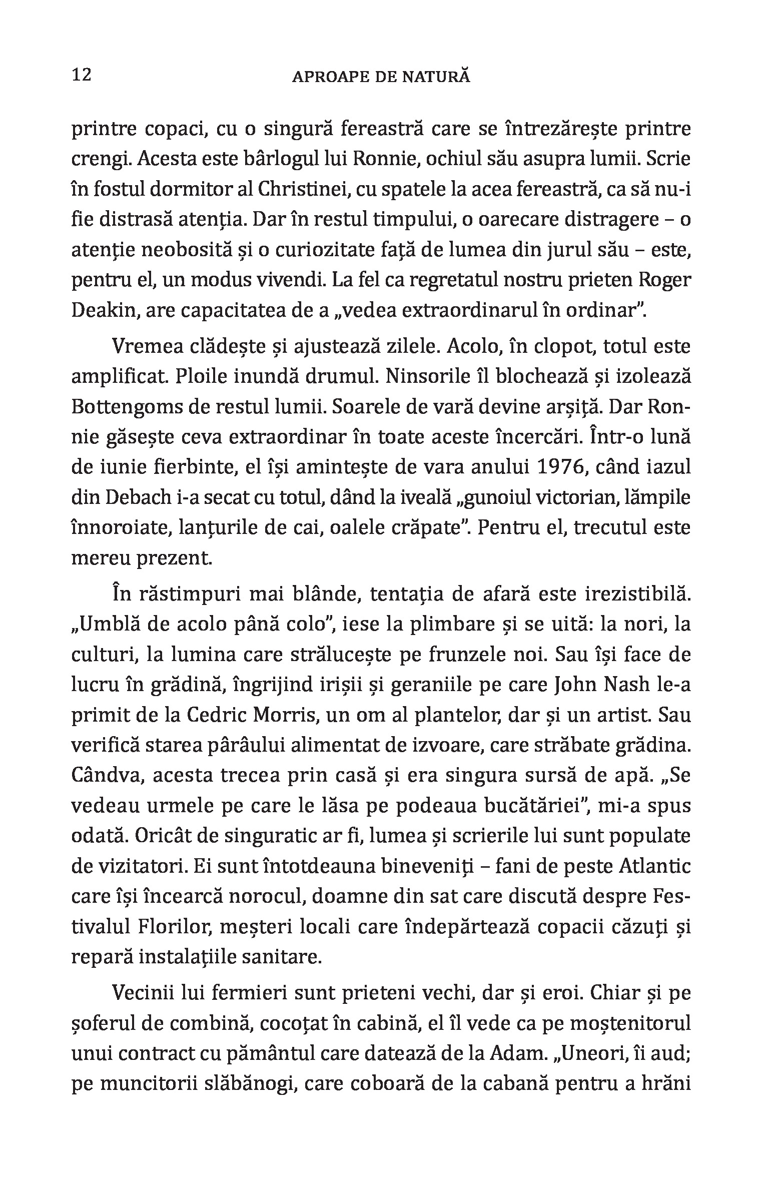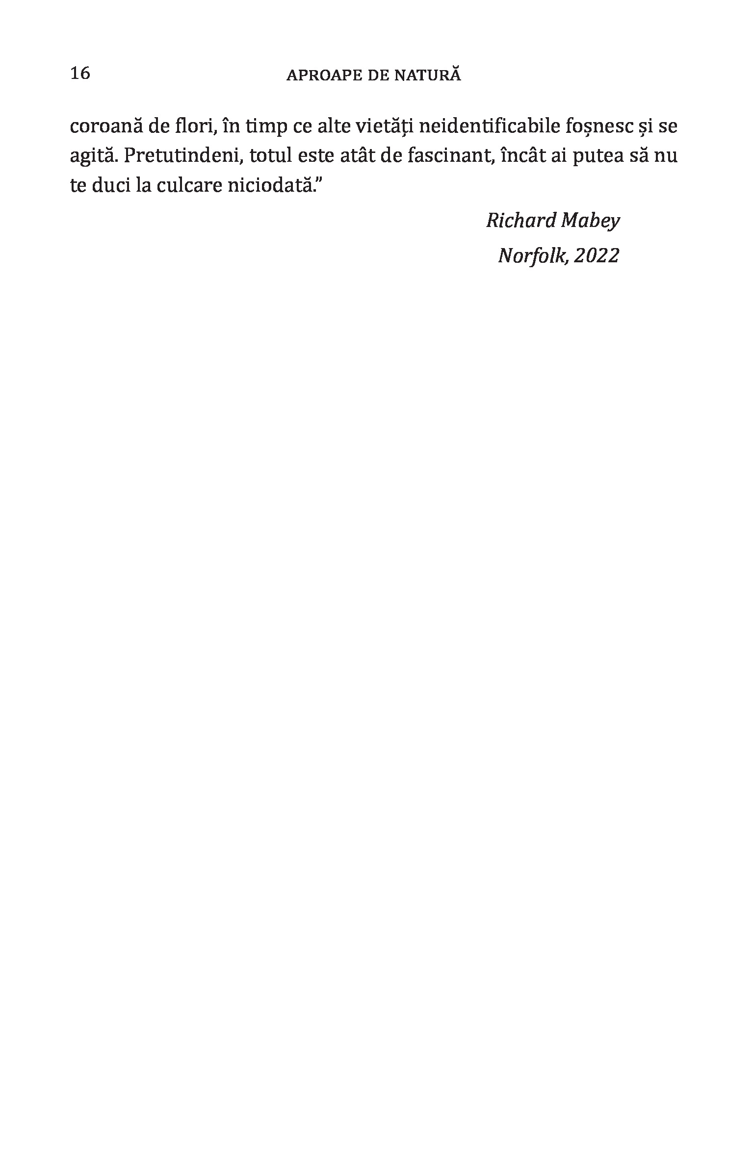 Aproape de natură: O viață în Anglia rurală / Next to Nature: A Lifetime in the English Countryside de Ronald Blythe, cu o introducere de Richard Mabey, este un frumos memento pentru cititorii citadini amintindu-le acestora de simplitatea și farmecul inegalabil al vieții de la țară. Altfel spus, „Aproape de natură” este o odă închinată peisajului rural englezesc care te va duce deseori cu gândul la cuvintele autohtonului Lucian Blaga: „eu cred că veșnicia s-a născut la sat”. O carte imposibil de povestit, dar care te va marca pe termen lung prin starea pe care ți-o transmite și care îți va rescrie ADN-ul pe baza frazei-cheie: „Viața nu trebuie să fie o permanentă alergătură.”