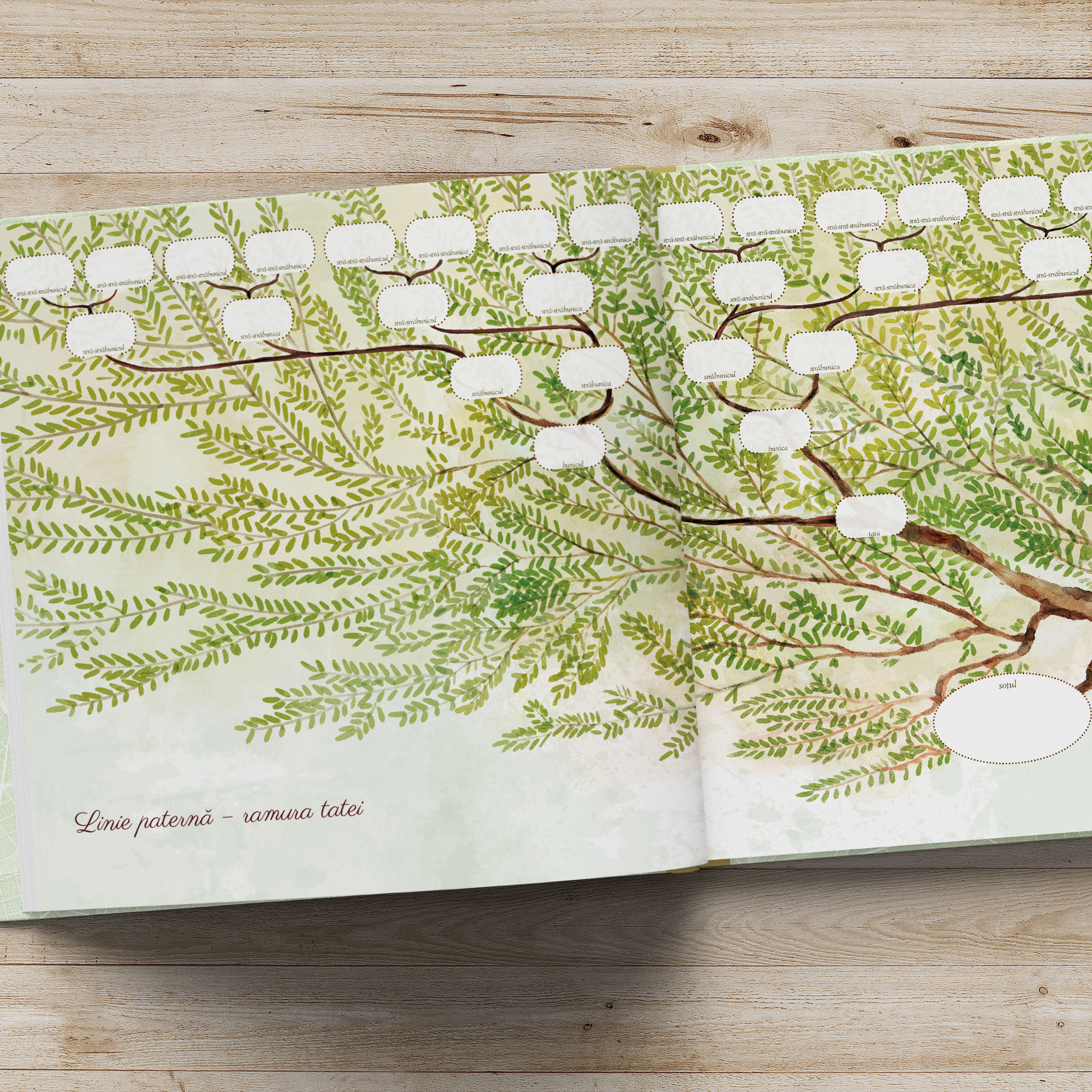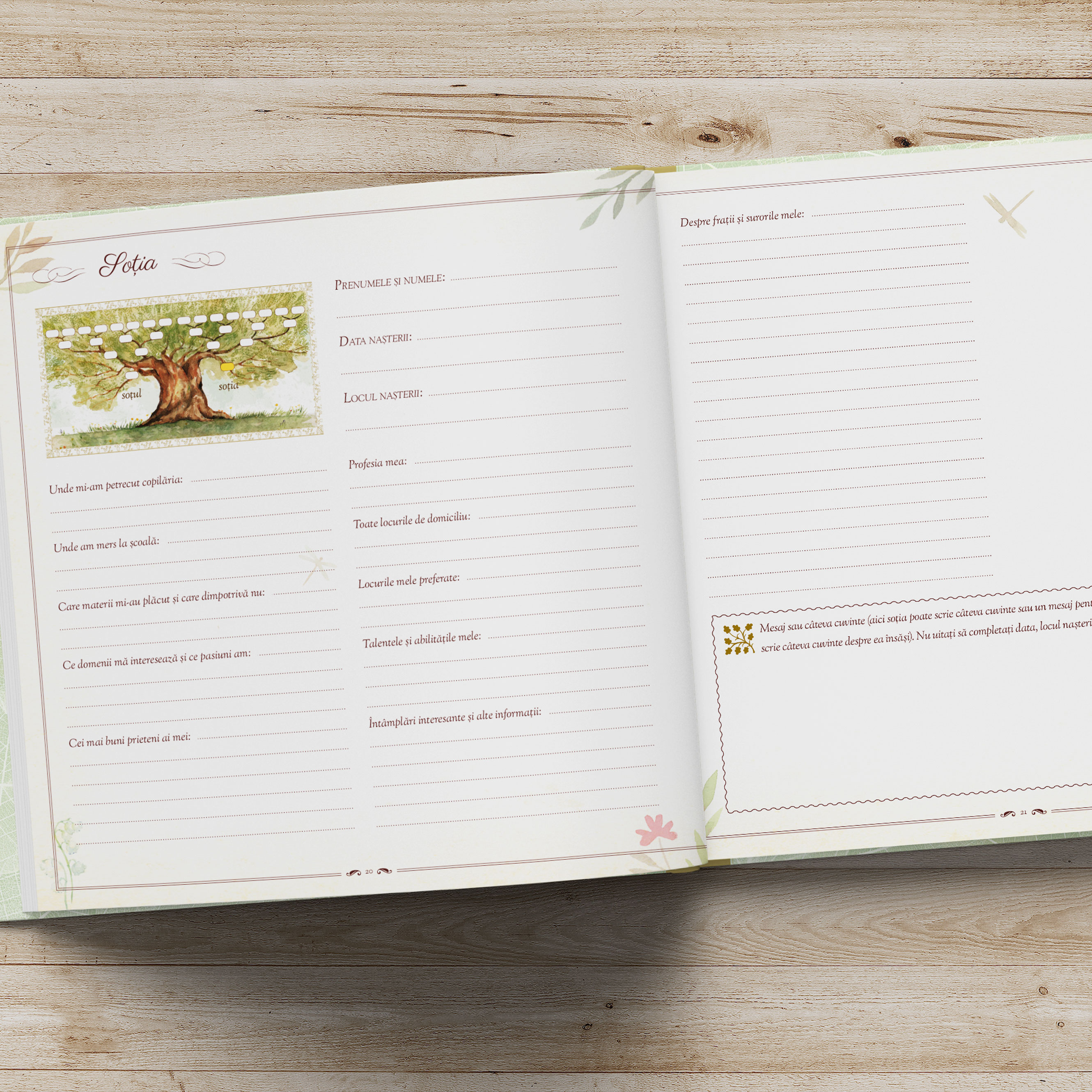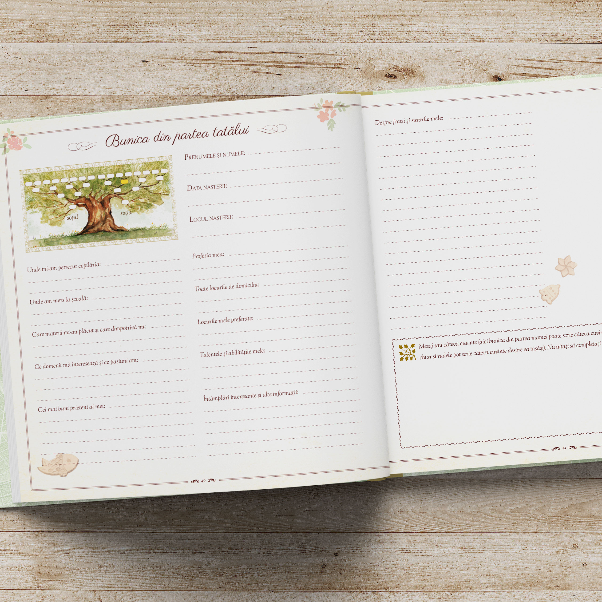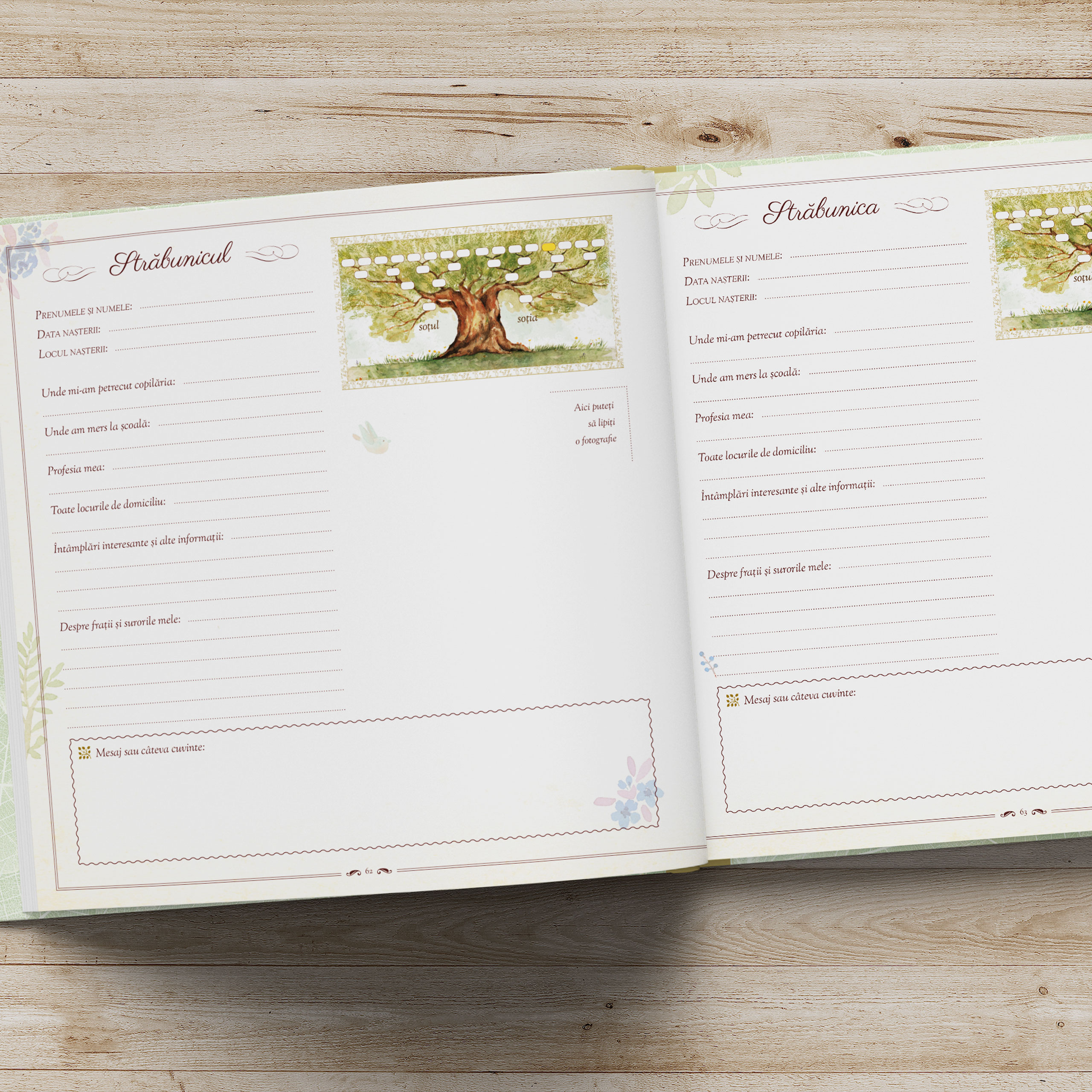 Cartea este foarte ingenios concepută, astfel încât să vă puteți include cu ușurință strămoșii până la a cincea generație, precum și toți descendenții. Pentru fiecare membru al familiei, puteți adăuga informații interesante despre el și despre viața sa, inclusiv o fotografie. De asemenea, puteți ruga una dintre rudele dvs. să scrie în carte un mesaj ca amintire – pentru dvs. și copiii dvs.