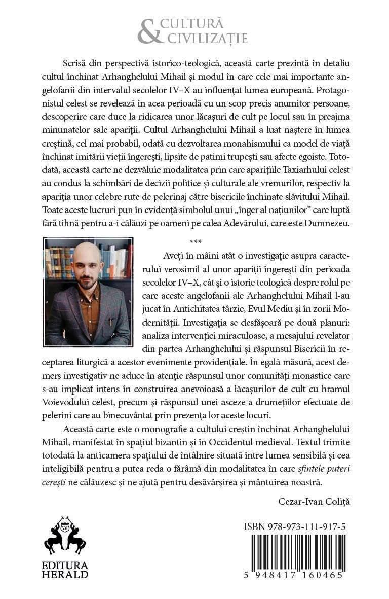 Aveti in maini atat o investigatie asupra caracterului verosimil al unor aparitii ingeresti din perioada secolelor IV–X, cat si o istorie teologica despre rolul pe care aceste angelofanii ale Arhanghelului Mihail l-au jucat in Antichitatea tarzie, Evul Mediu si in zorii Modernitatii. Investigatia se desfasoara pe doua planuri: analiza interventiei miraculoase, a mesajului revelator din partea Arhanghelului si raspunsul Bisericii in receptarea liturgica a acestor evenimente providentiale. In egala masura, acest demers investigativ ne aduce in atentie raspunsul unor comunitati monastice care s-au implicat intens in construirea anevoioasa a lacasurilor de cult cu hramul Voievodului celest, precum si raspunsul unei asceze a drumetiilor efectuate de pelerini care au binecuvantat prin prezenta lor aceste locuri. Aceasta carte este o monografie a cultului crestin inchinat Arhanghelului Mihail, manifestat in spatiul bizantin si in Occidentul medieval. Textul trimite totodata la anticamera spatiului de intalnire situata intre lumea sensibila si cea inteligibila pentru a putea reda o farama din modalitatea in care sfintele puteri ceresti ne calauzesc si ne ajuta pentru desavarsirea si mantuirea noastra.