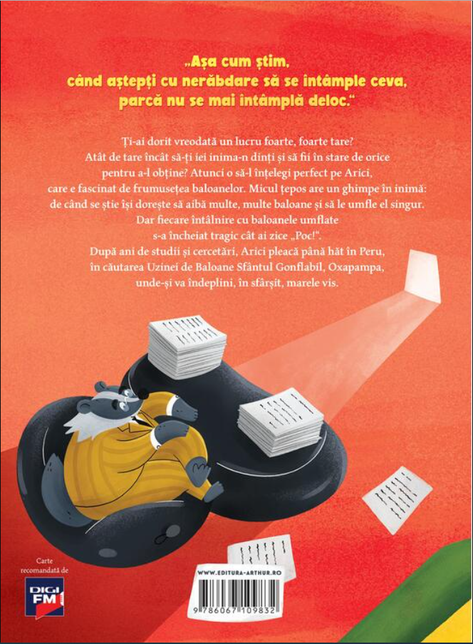 Ți-ai dorit vreodată un lucru foarte tare? Atât de tare încât să-ți iei inima în dinți și să fii în stare de orice pe a-l obține? Atunci o să-l înțelegi perfect pe Arici, care e fascinat de frumusețea baloanelor. Micul țepos are un ghimpe în inimă: de când se știe își dorește să aibă multe, multe baloane și să le umfle el singur. Dar fiecare întâlnire cu baloanele umflate s-a încheiat tragic cât ai zice „Poc!”. După ani de studii și cercetări, Arici pleacă până hăt, în Peru, în căutarea Uzinei de Baloane Sfântul Gonflabil, Oxapampa, unde-și va îndeplini, în sfârșit, marele vis.