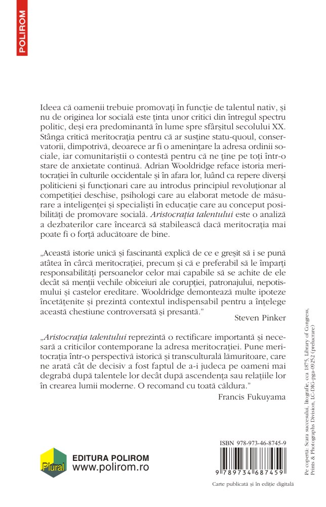 „Această istorie unică și fascinantă explică de ce e greșit să i se pună atâtea în cârcă meritocrației, precum și că e preferabil să le împarți responsabilități persoanelor celor mai capabile să se achite de ele decât să menții vechile obiceiuri ale corupției, patronajului, nepotismului și castelor ereditare. Wooldridge demontează multe ipoteze încetățenite și prezintă contextul indispensabil pentru a înțelege această chestiune controversată și presantă.” (Steven Pinker)