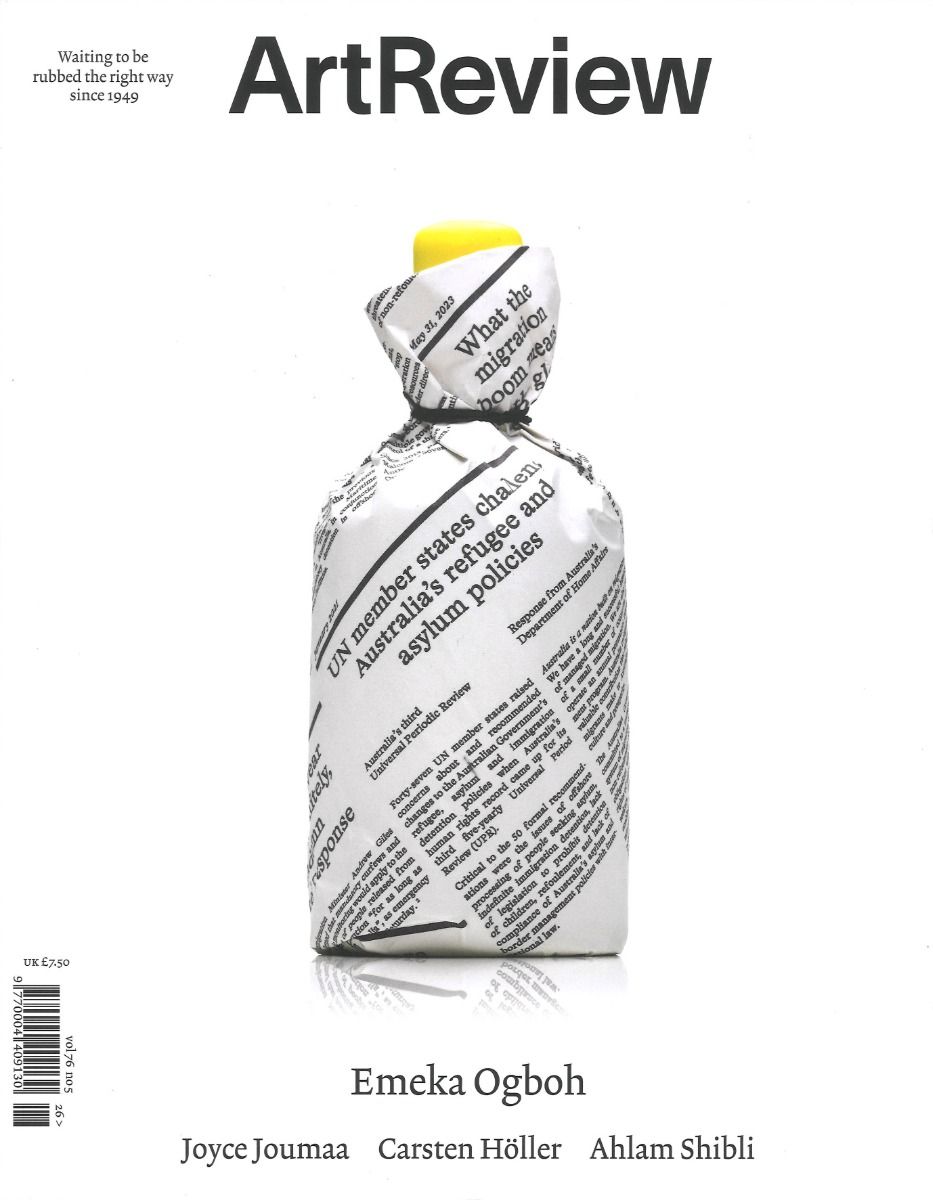 ArtReview’s Summer issue ponders the mutability of place. On the cover is Emeka Ogboh’s Boats, a gin made from Tasmanian and West African botanicals as part of the artist’s ongoing explorations of home and belonging that also include soundscapes. Carsten Höller and Adam Haar discuss their new sleep factory and experiments in dream influencing. Palestinian photographer Ahlam Shibli’s decades-long practice is the focus of an essay on her homeland’s history of occupation, violence and displacement. And Joyce Joumaa’s recent research-based videowork is examined for the ways in which it addresses both her home country of Lebanon and the geography of the migrant experience. Also in this issue, an interview with filmmaker Ephraim Asili and a column on David Adjaye’s architectural legacy in Accra, along with book and exhibition reviews from London, New York and Tokyo.