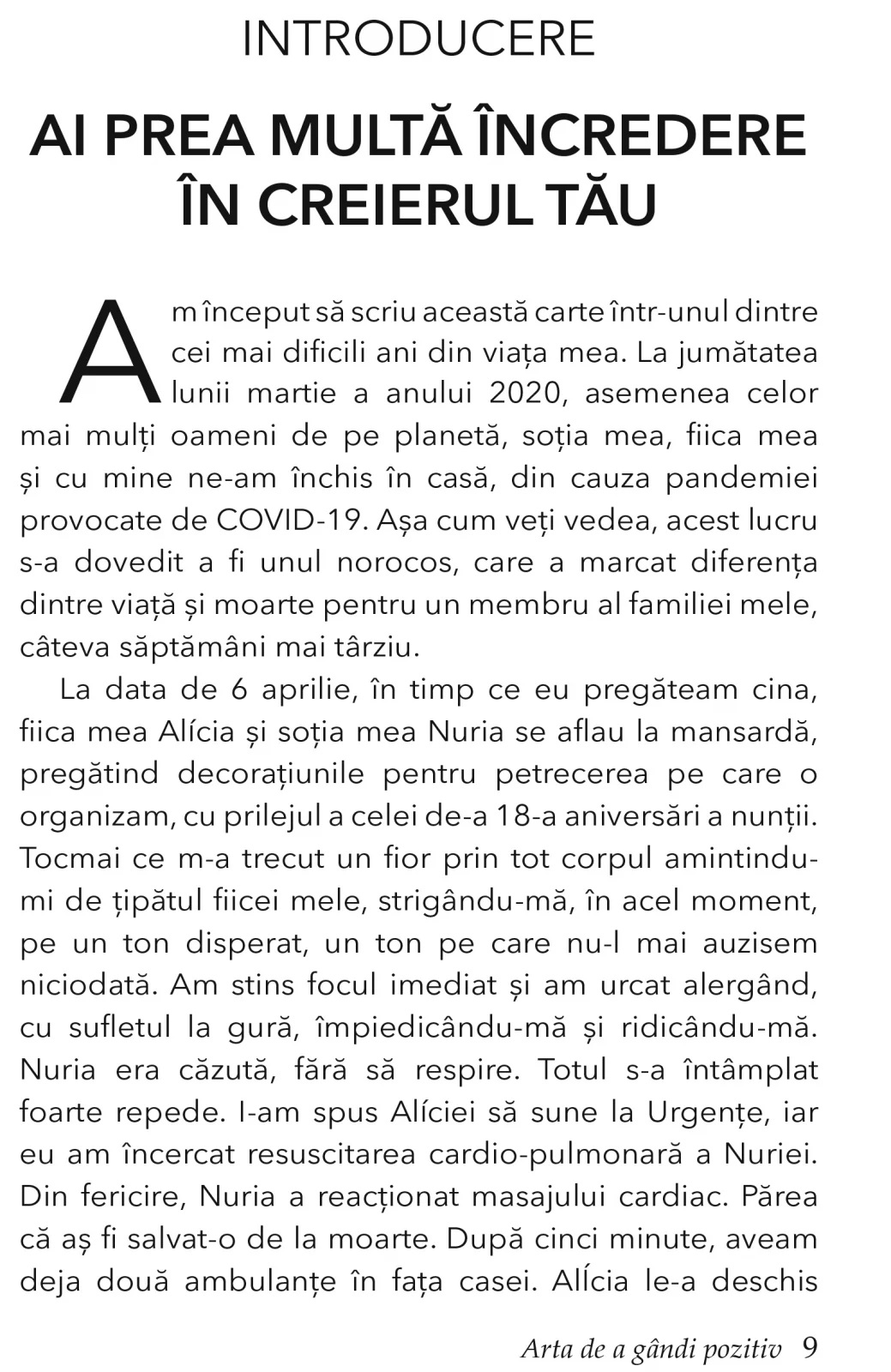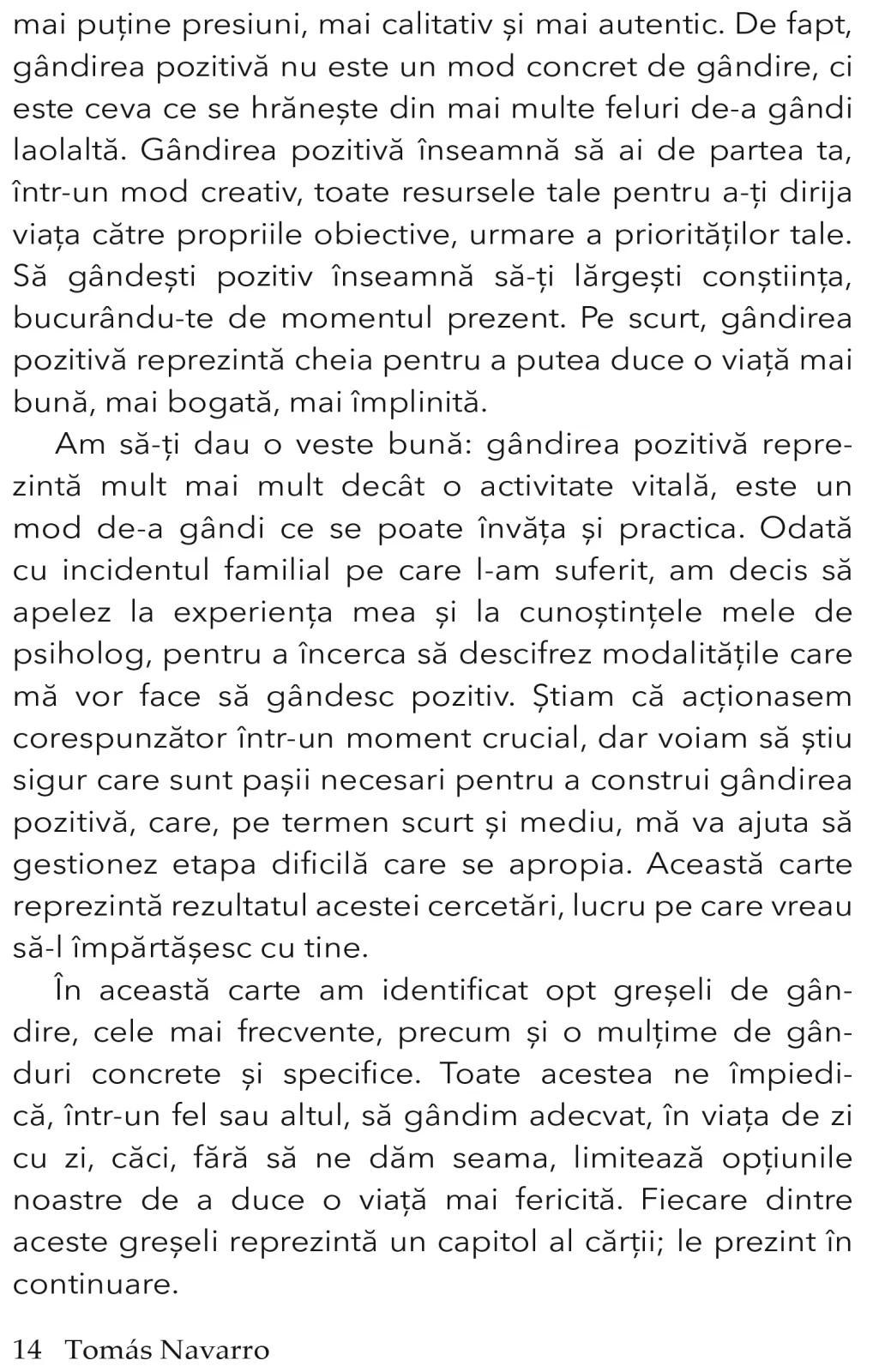 In cartea Arta de a gandi pozitiv, Tomas Navarro explica faptul ca secretul realizarii unei vieti depline este sa inveti sa gandesti pozitiv si sa stii sa distingi gandurile rationale de cele care ne dauneaza si nu ne permit sa ne dezvoltam. Pentru a face acest lucru, este important sa stim cum functioneaza cre¬ierul nostru si sa intelegem ca misiunea sa principala este de a ne mentine in viata, asa ca uneori facem greseli si nu gandim corect.