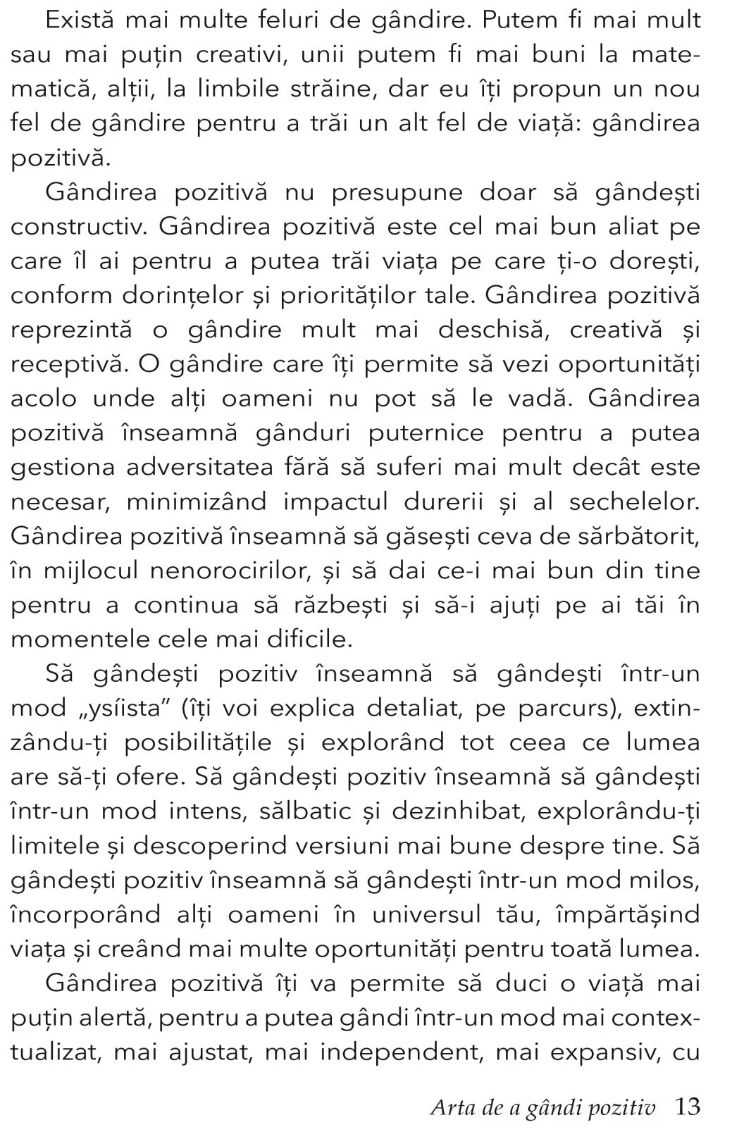 In aceasta carte, autorul identifica cele mai frecvente opt greseli de gandire si dezvaluie cheile gandirii pozitive, un nou stil de gandire mai deschis si mai expansiv, care va invita sa va explorati limitele pentru a ajunge la cea mai buna versiune a voastra. Gandirea pozitiva este cel mai bun aliat pe care il aveti pentru a putea trai viata in conformitate cu dorintele si prioritatile voastre. Gandirea pozitiva va permite sa vedeti oportunitati acolo unde alti oameni nu pot. A gandi pozitiv inseamna sa te inarmezi cu rezistenta de a gestiona adversitatea fara a suferi mai mult decat este necesar si sa fii plin de compasiune fata de cei din jurul tau.