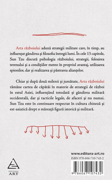 Arta războiului adună strategii militare care, în timp, au influențat gândirea și filosofia întregii lumi. În cele 13 capitole, Sun Tzu discută psihologia războiului, strategii, folosirea terenului și a condițiilor meteo în propriul avantaj, utilizarea spionilor, dar și realizarea și păstrarea alianțelor.