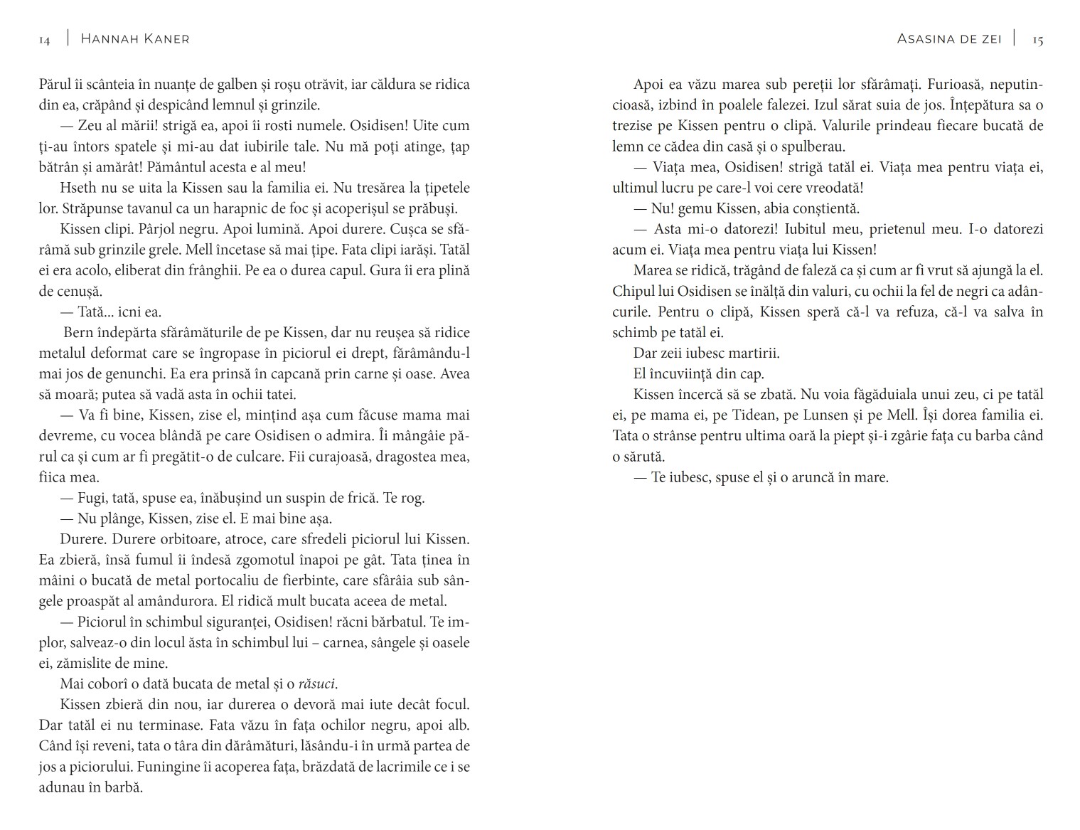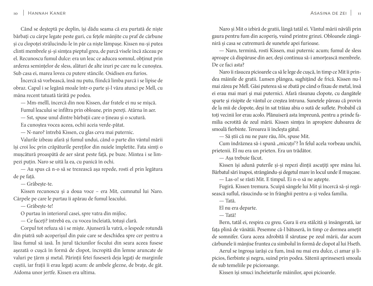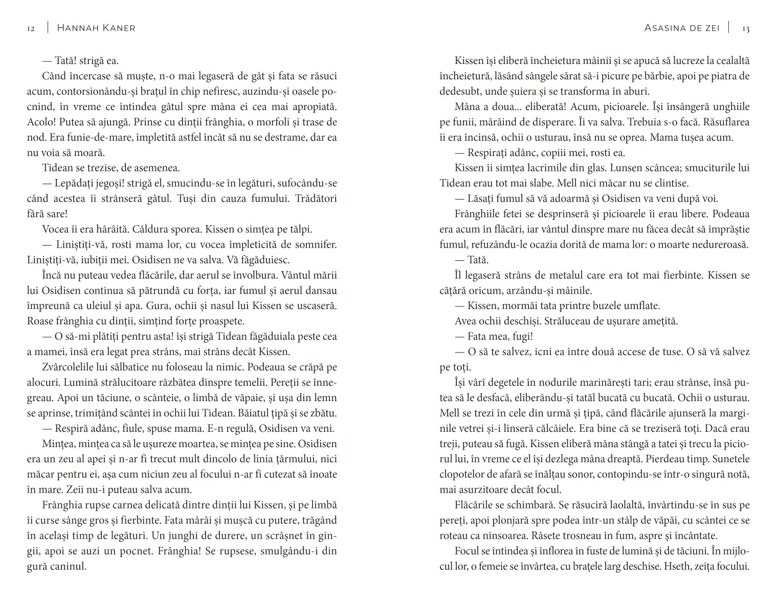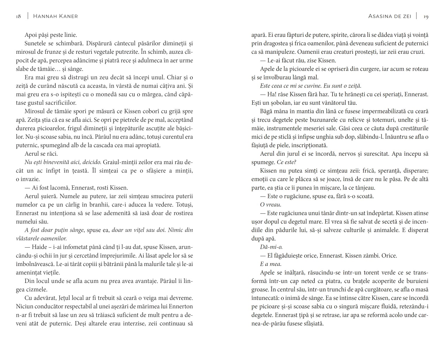 Originară din Northumbria, HANNAH KANER locuiește în Scoția. Este consultant digital în Edinburgh, furnizând instrumente și servicii digitale pentru sectorul public. Este licențiată în limba engleză la Pembroke College, Cambridge, și are un master în știință la Universitatea din Edinburgh. Își găsește inspirația în mitologie, în subiecte care tratează problemele cu care se confruntă femeile, în ficțiunea speculativă și în poveștile pe care ni le spunem despre ce înseamnă să fii om. Drepturile pentru romanul său de debut, Asasina de zei, au fost achiziționate în 2021 de Harper Voyager și, după lansarea din ianuarie 2023, cartea a urcat instantaneu pe primul loc în topul Sunday Times.