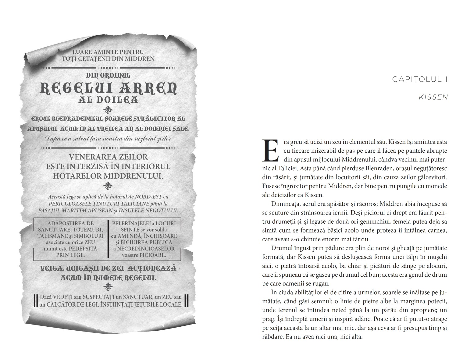 Familia lui Kissen a fost ucisă de fanaticii unui zeu al focului. Acum, Kissen este deicid, adică o persoană care își câștigă existența ucigând zei. Asta până când întâlnește unul pe care nu‑l poate omorî: Skedi, un zeu al minciunilor albe, a cărui viață este legată misterios de cea a unui tânăr nobil, amândoi fiind urmăriți de ucigași necunoscuți.