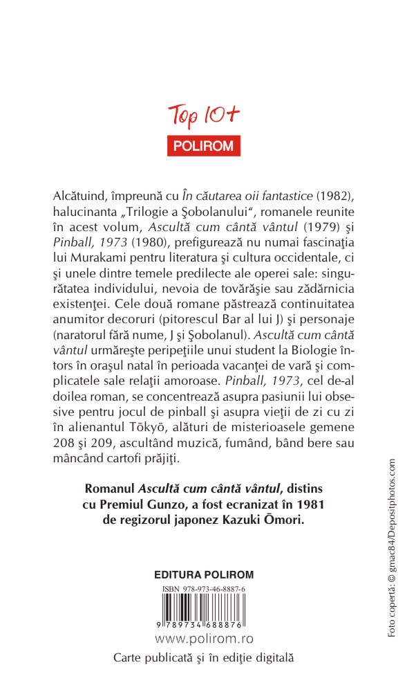 Alcătuind, împreună cu În căutarea oii fantastice (1982), halucinanta „Trilogie a Şobolanului”, romanele reunite în acest volum, Ascultă cum cântă vântul (1979) şi Pinball, 1973 (1980), prefigurează nu numai fascinaţia lui Murakami pentru literatura şi cultura occidentale, ci şi unele dintre temele predilecte ale operei sale: singurătatea individului, nevoia de tovărăşie sau zădărnicia existenţei. Cele două romane păstrează continuitatea anumitor decoruri (pitorescul Bar al lui J) şi personaje (naratorul fără nume, J şi Şobolanul). Ascultă cum cântă vântul urmăreşte peripeţiile unui student la Biologie întors în oraşul natal în perioada vacanţei de vară şi complicatele sale relaţii amoroase. Pinball, 1973, cel de-al doilea roman, se concentrează asupra pasiunii lui obsesive pentru jocul de pinball şi asupra vieţii de zi cu zi în alienantul Tōkyō, alături de misterioasele gemene 208 şi 209, ascultând muzică, fumând, bând bere sau mâncând cartofi prăjiţi.