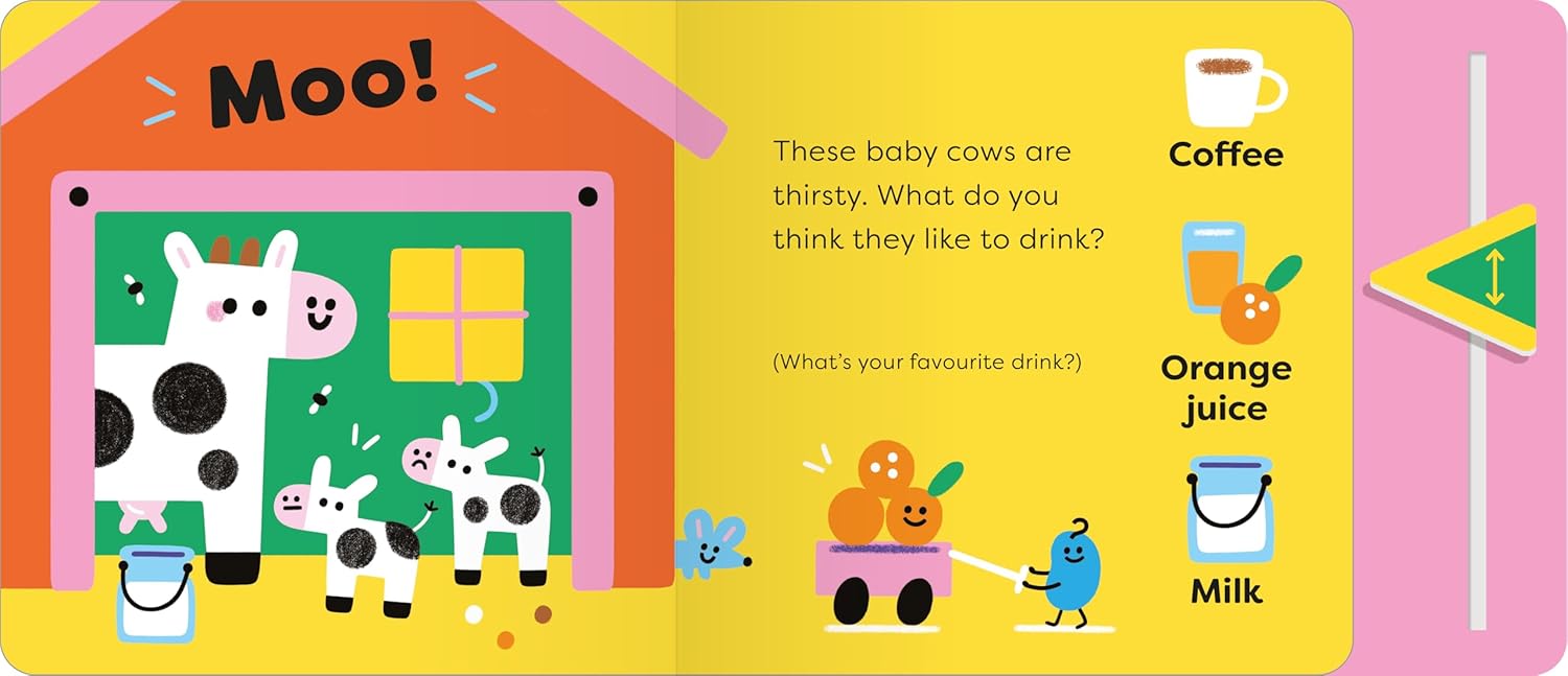 Move the slider mechanism to answer funny questions about baby farm animals and lift five flaps to find hidden creatures!