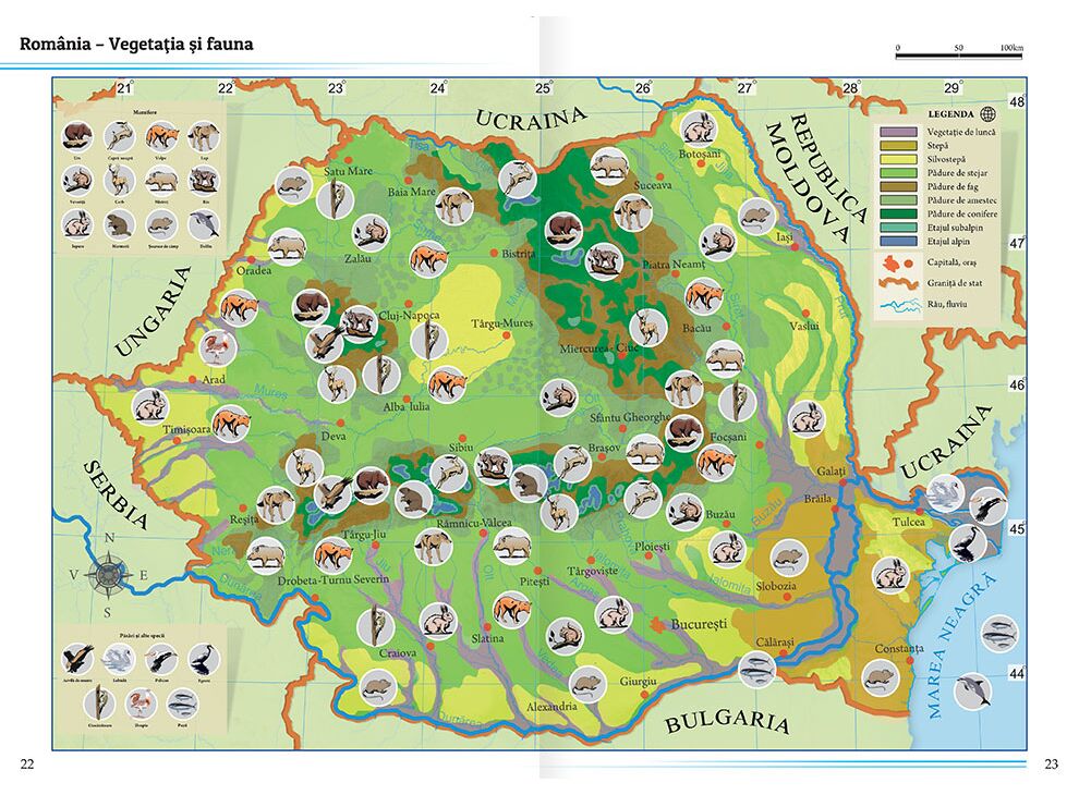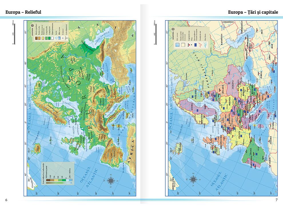 Atlas geografic elaborat în conformitate cu programele școlare în vigoare, cu hărți generale și tematice, color, care descriu Pământul, Europa și România.