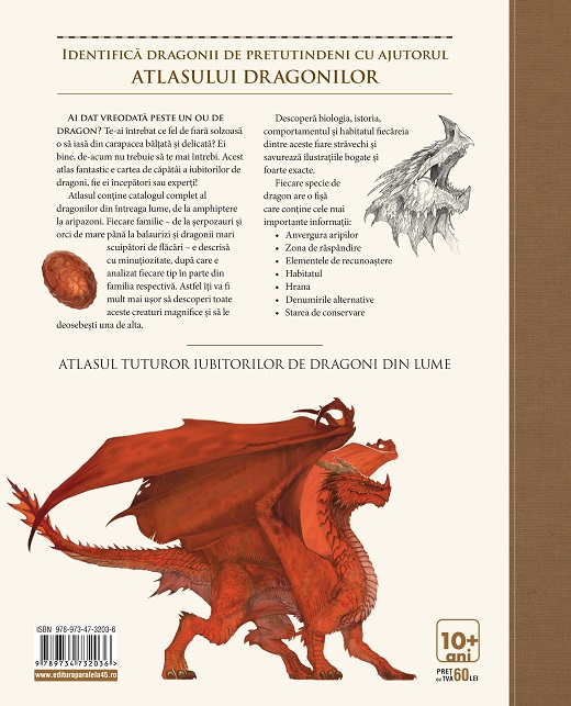 Ai dat vreodată peste un ou de dragon? Te‑ai întrebat ce fel de fiară solzoasă o să iasă din carapacea bălțată și delicată? Ei bine, de‑acum nu trebuie să te mai întrebi. Acest atlas fantastic e cartea de căpătâi a iubitorilor de dragoni, fie ei începători sau experți!