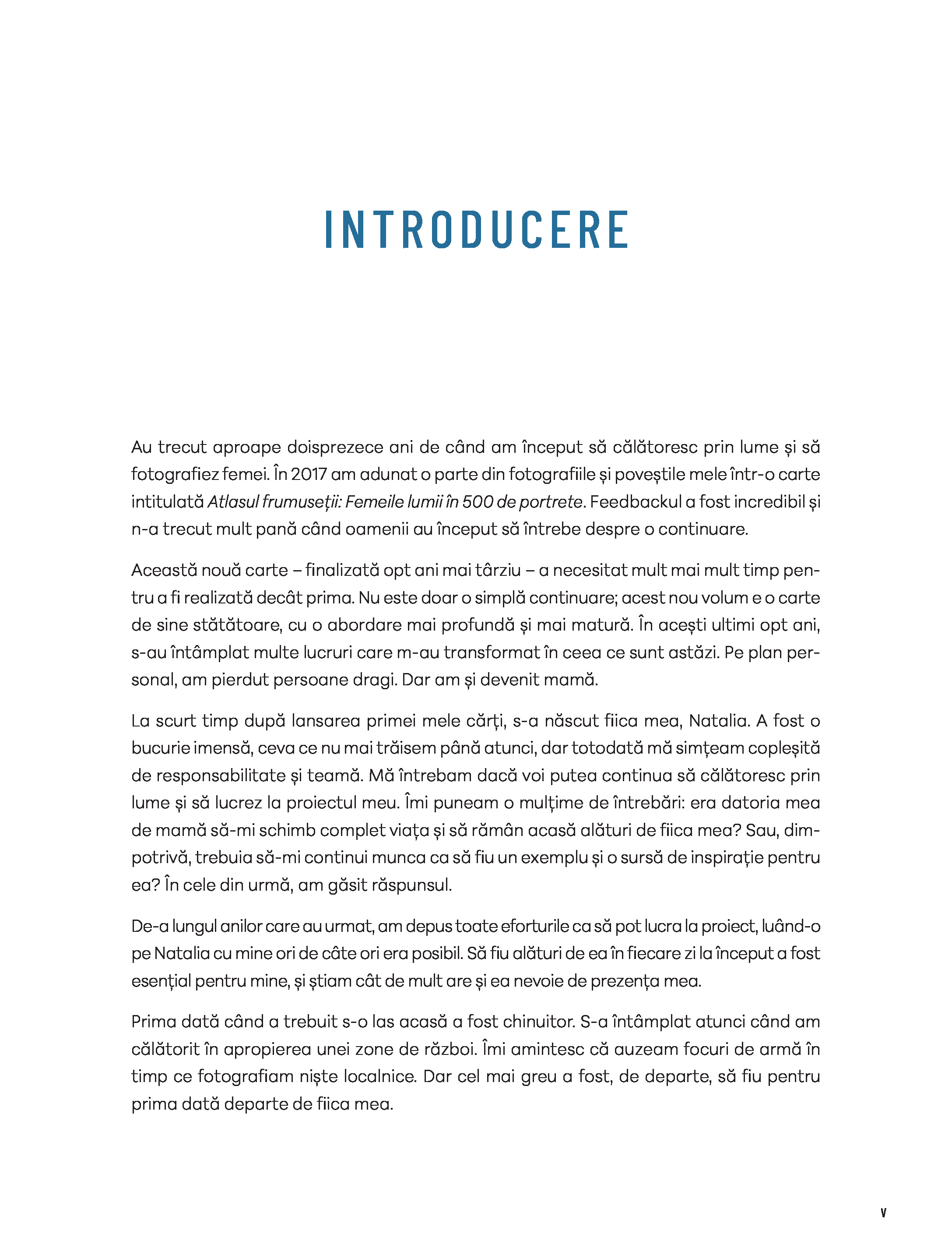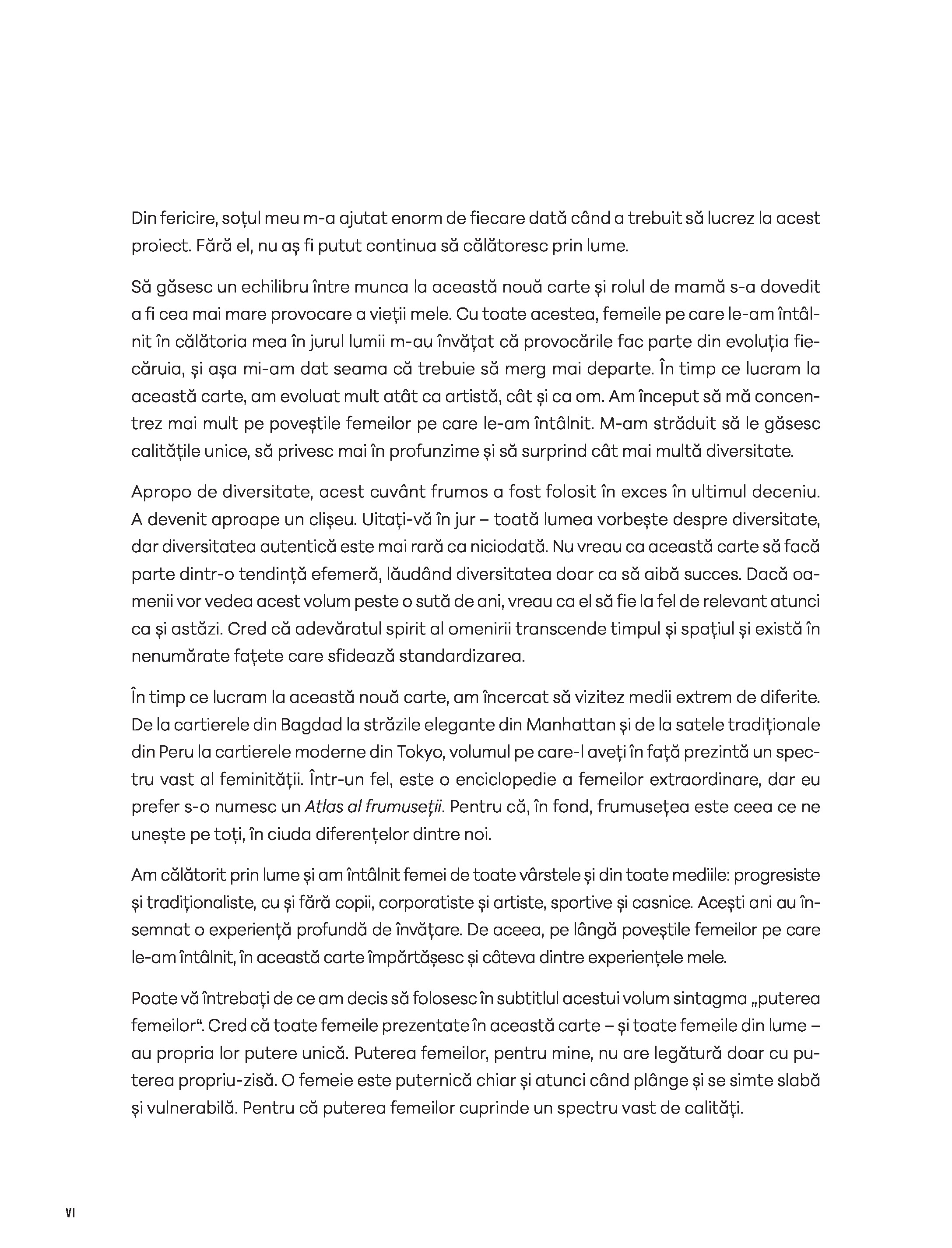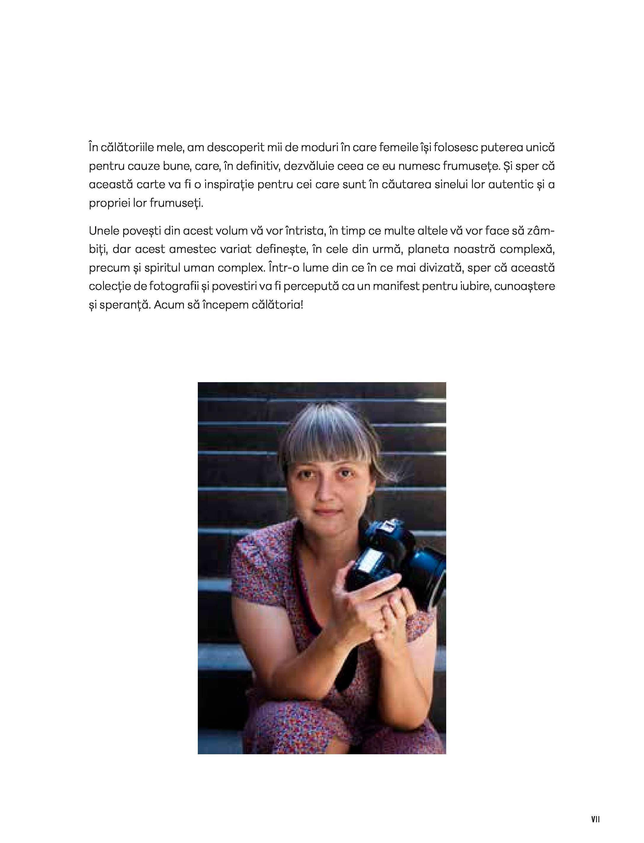500 de noi portrete, din peste 60 de țări – un omagiu vizual adus diversității, frumuseții și puterii femeilor din întreaga lume. Poveștile de viață ce completează fiecare portret sunt tot atâtea lecții despre curajul, libertatea și forța interioară care definesc fiecare femeie. Sunt totodată lecții prețioase despre puterea de a fi autentică, de a depăși diferite obstacole și de a schimba lumea. Noua carte a Mihaelei Noroc ne învață că frumusețea adevă­rată izvorăște din curajul de a trăi liber și din forța de a fi tu însăți.