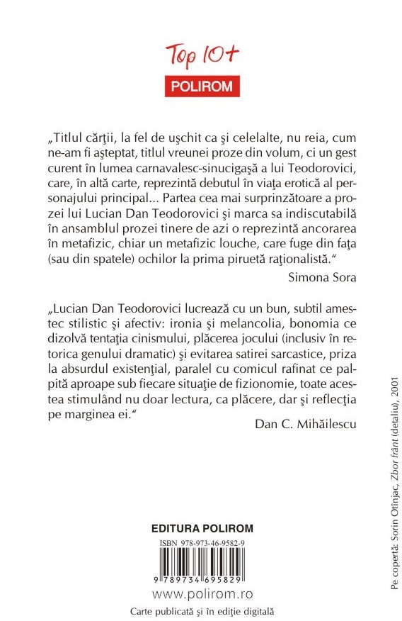 „Titlul cărţii, la fel de uşchit ca şi celelalte, nu reia, cum ne-am fi aşteptat, titlul vreunei proze din volum, ci un gest curent în lumea carnavalesc-sinucigaşă a lui Teodorovici, care, în altă carte, reprezintă debutul în viaţa erotică al personajului principal... Partea cea mai surprinzătoare a prozei lui Lucian Dan Teodorovici şi marca sa indiscutabilă în ansamblul prozei tinere de azi o reprezintă ancorarea în metafizic, chiar un metafizic louche, care fuge din faţa (sau din spatele) ochilor la prima piruetă raţionalistă.” (Simona Sora)