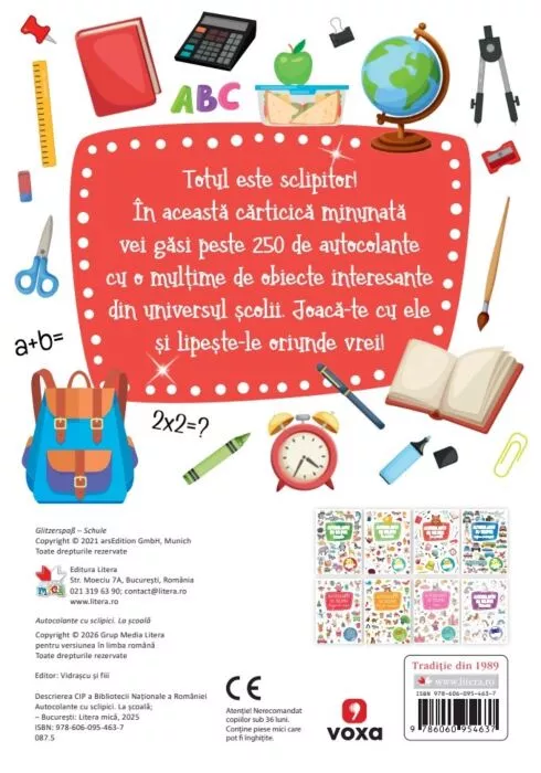 Totul este sclipitor! În această cărticică minunată vei găsi peste 250 de autocolante cu o mulţime de obiecte interesante din universul școlii.