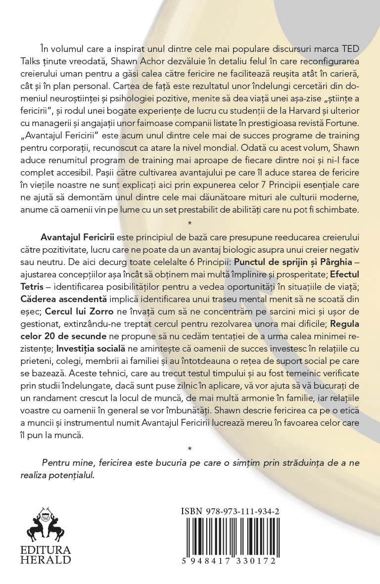 In volumul care a inspirat unul dintre cele mai populare discursuri marca TED Talks tinute vreodata, Shawn Achor dezvaluie in detaliu felul in care reconfigurarea creierului uman pentru a gasi calea catre fericire ne faciliteaza reusita atat in cariera, cat si in plan personal. Cartea de fata este rezultatul unor indelungi cercetari din domeniul neurostiintei si psihologiei pozitive, menite sa dea viata unei asa-zise „stiinte a fericirii”, si rodul unei bogate experiente de lucru cu studentii de la Harvard si ulterior cu managerii si angajatii unor faimoase companii listate in prestigioasa revista Fortune. „Avantajul Fericirii” este acum unul dintre cele mai de succes programe de training pentru corporatii, recunoscut ca atare la nivel mondial. Odata cu acest volum, Shawn aduce renumitul program de training mai aproape de fiecare dintre noi si ni-l face complet accesibil. Pasii catre cultivarea avantajului pe care il aduce starea de fericire in vietile noastre ne sunt explicati aici prin expunerea celor 7 Principii esentiale care ne ajuta sa demontam unul dintre cele mai daunatoare mituri ale culturii moderne, anume ca oamenii vin pe lume cu un set prestabilit de abilitati care nu pot fi schimbate.