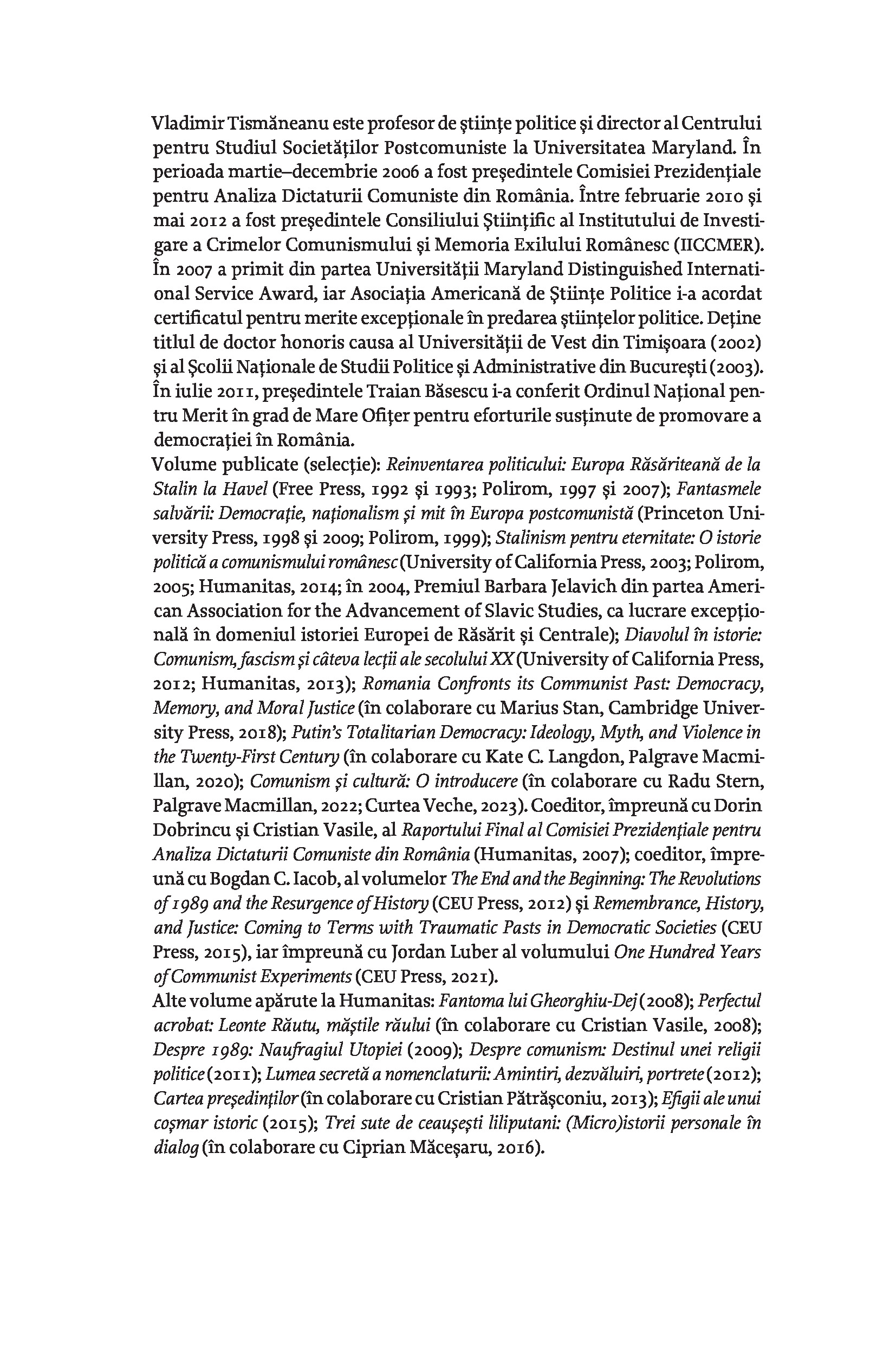 Multe din concluziile sale devin adevăruri de manual. Vladimir Tismăneanu este un îmblânzitor al demonilor Istoriei, un maître à penser în marea tradiție – pentru a mă restrânge la trei nume – a lui Albert Camus, a Hannei Arendt și a lui Raymond Aron.“ — MIRCEA MIHĂIEȘ