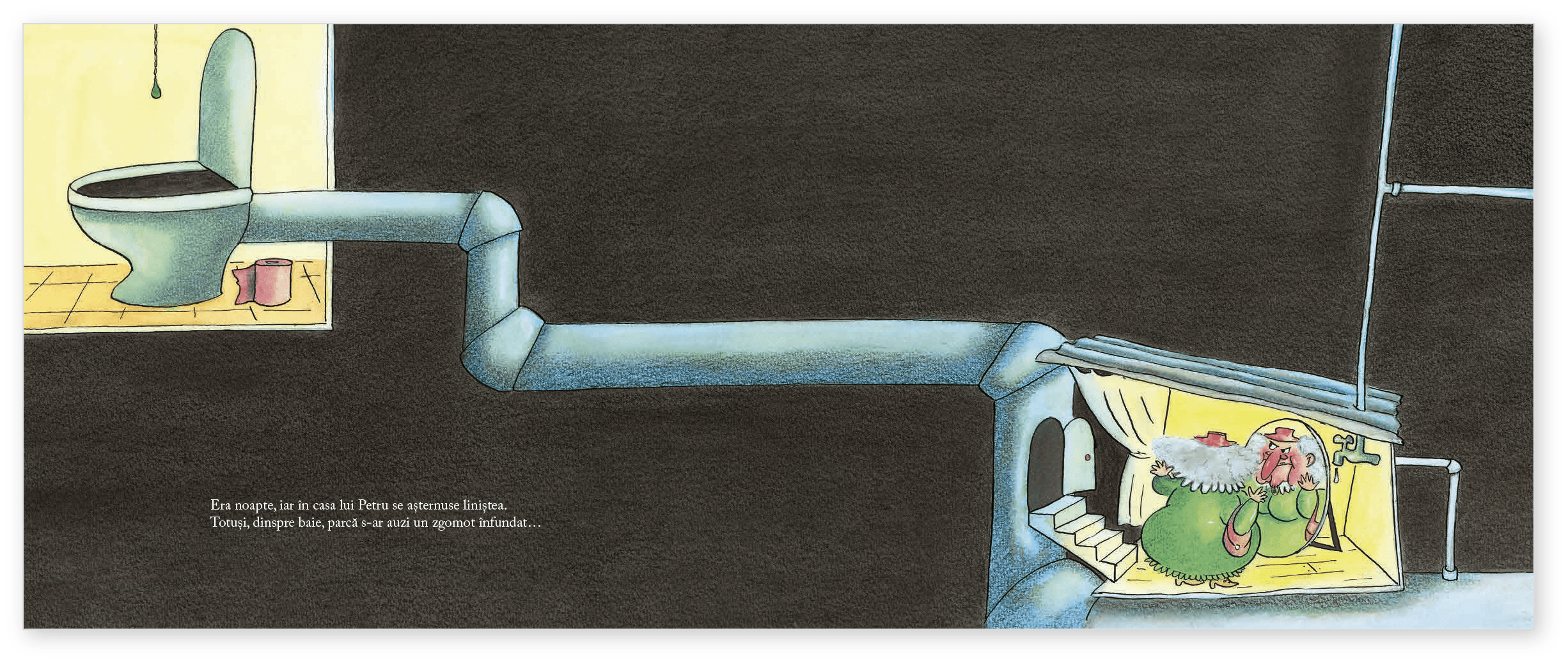 Face un zgomot suspect sub vasul de toaletă, lasă urme umede peste tot prin casă… Trimis la culcare devreme pentru că a refuzat să-și mănânce supa de legume, Petru găsește o modalitate ingenioasă de a scăpa nu numai de vrăjitoare, ci și de supa neîmbietoare…