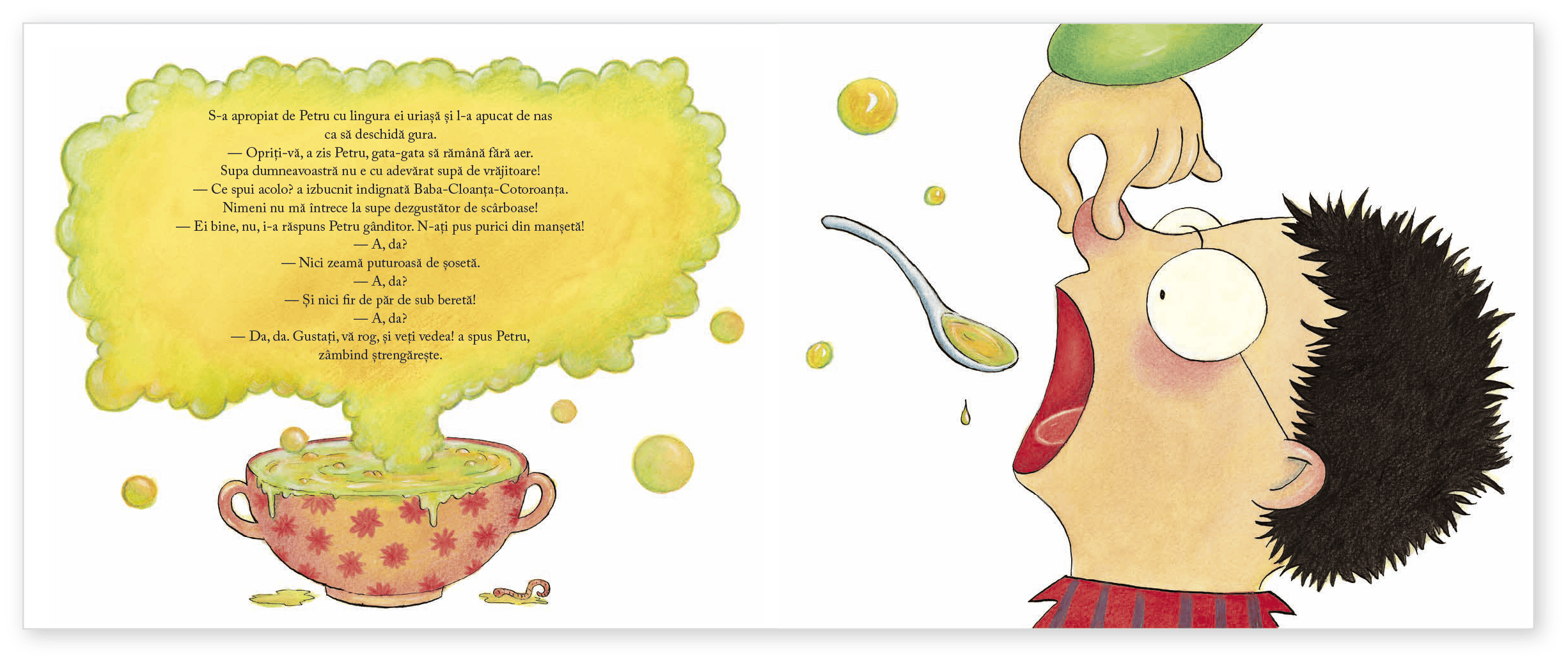 După primul album, un copil de la o școală pe care cei doi au vizitat-o și-a imaginat că vrăjitoarea sechestrată își construia o casă dedesubtul toaletei. A fost suficient să se nască o continuare a aventurilor lui Petru și a Babei-Cloanța-Cotoroanța, despre senzația copleșitoare de a fi obligat să mănânci ceva ce nu îți place, dar și despre puterea de a te împotrivi și de a găsi o o soluție surprinzătoare și curajoasă.