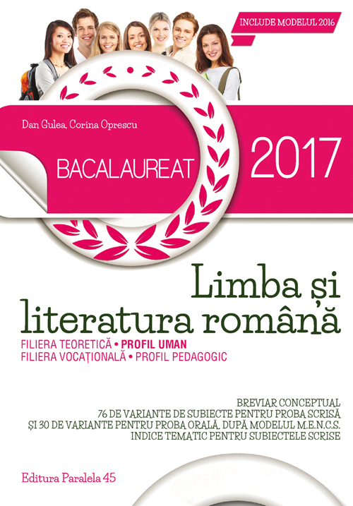 Lucrarea Bacalaureat 2017. Limba şi literatura română – profil Uman este companionul firesc al absolvenţilor şi elevilor de liceu pentru pregătirea examenului de maturitate, adresându-se deopotrivă candidaţilor sesiunilor speciale, ai sesiunilor de vară şi de toamnă organizate de Ministerul Educaţiei Naţionale şi Cercetării ştiinţifice, de la Filiera teoretică – profilul Uman şi Filiera vocaţională – profilul Pedagogic.
