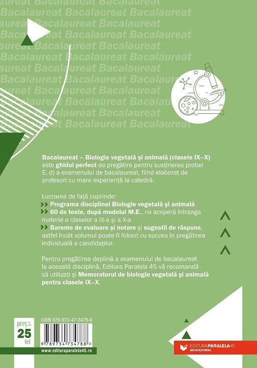 Pentru pregătirea integrală a examenului de bacalaureat la această disciplină, Editura Paralela 45 vă recomandă sa utilizați și Memoratorul de biologie vegetală și animală pentru clasele IX-X.